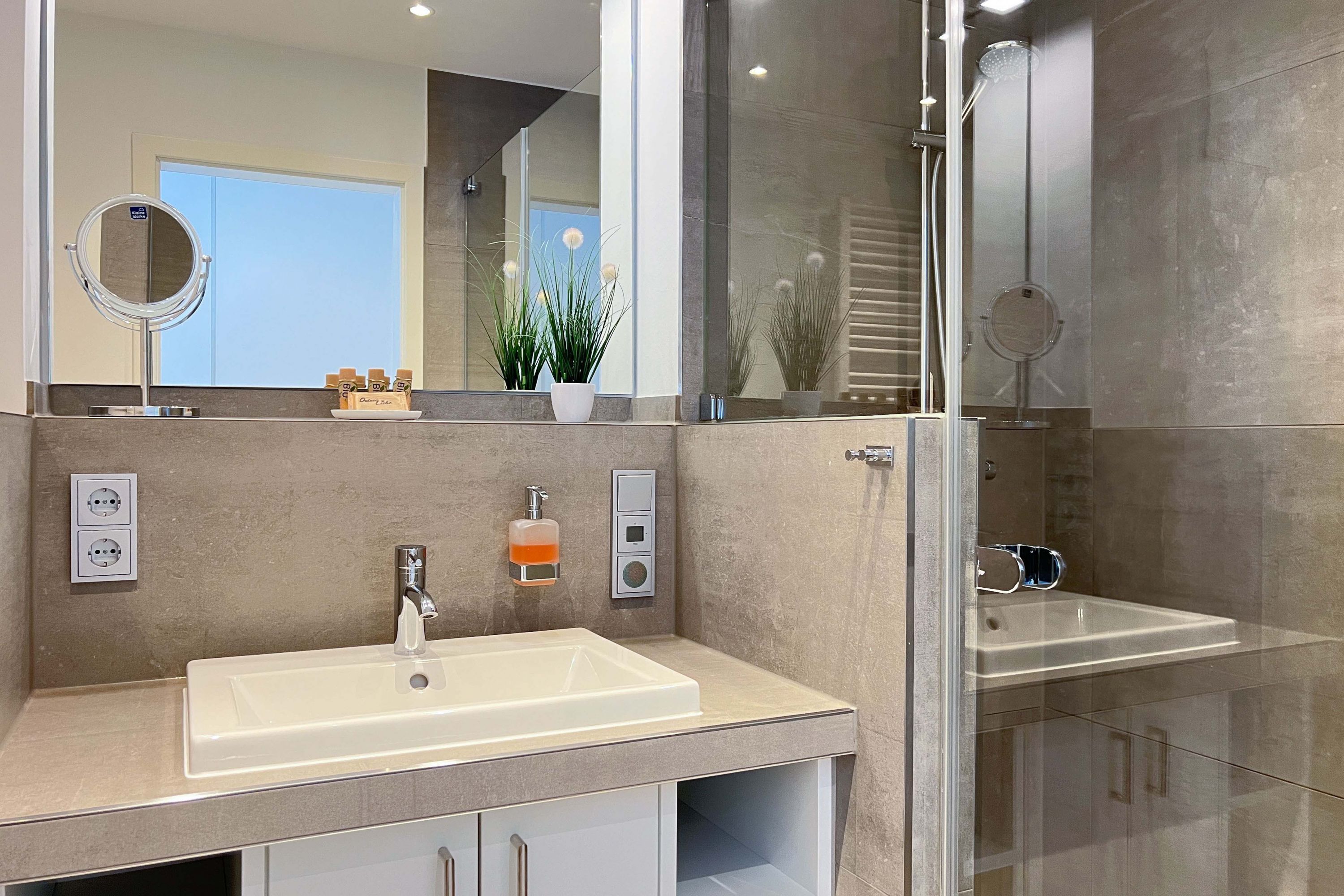 • Modernes Badezimmer mit ebenerdiger Dusche und hochwertigen Armaturen