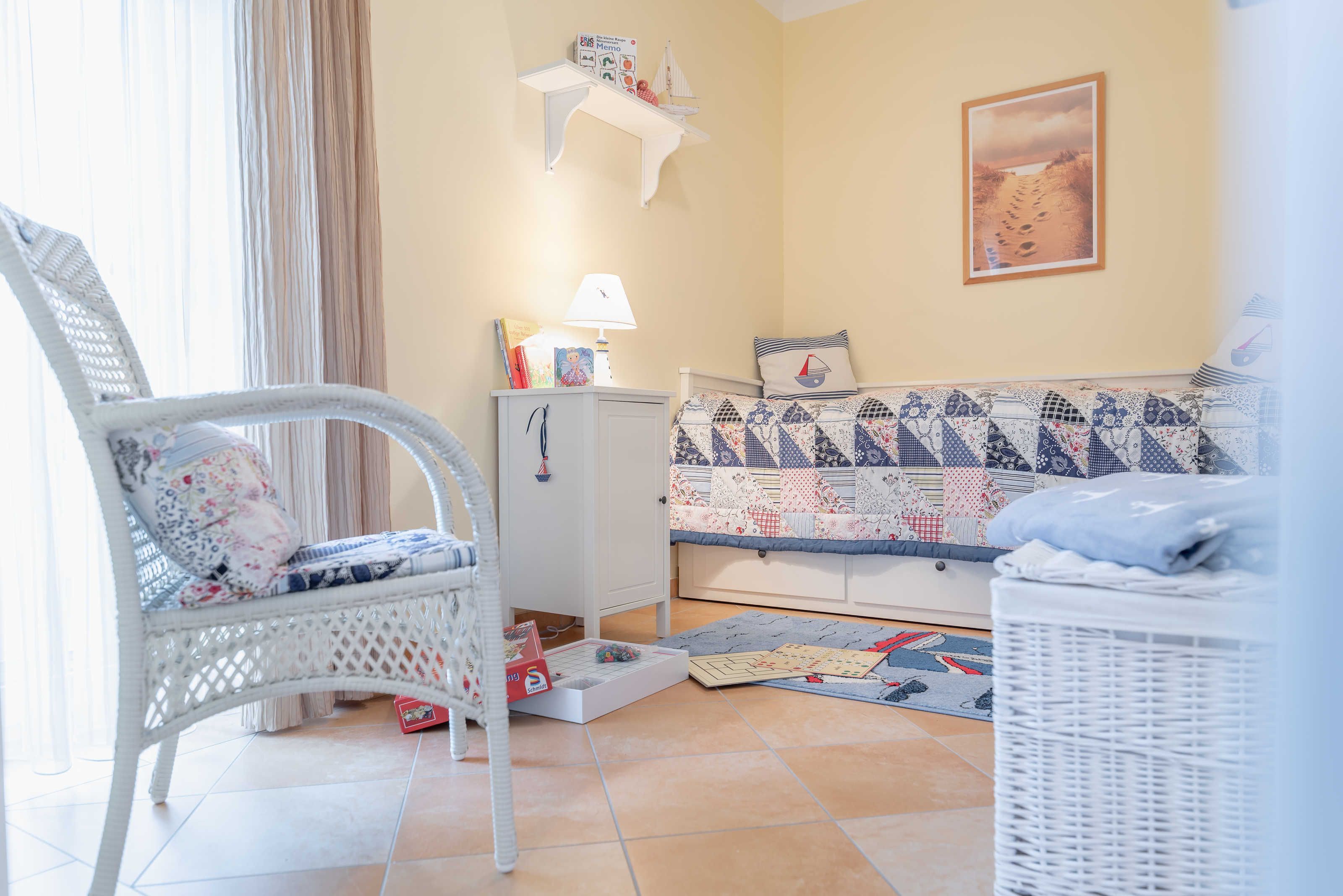 Genießen Sie die komfortable Ausstattung im geschmackvollen Wohnzimmer mit offener Wohnküche. Die hochwertige Küche ist umfangreich ausgestattet. Das geräumiges Schlafzimmer verfügt über ein großes Doppelbett und ein Kinderbett. Ein weiterer kleinerer Schlafraum bietet zwei zusätzliche Schlafmöglichkeiten (Ausziehbett). Die Schlafzimmer sind mit Verdunkelungsrollos und Fliegengitter ausgestattet. Das moderne Duschbad verfügt über eine bodengleiche Dusche, eine Toilette und einer Waschmaschine. Entspannen Sie auch auf unserer vollmöblierten Terrasse mit XXL Strandkorb. Dieser ist schon um die ganze Welt gesegelt. Vielleicht können Sie das Rauschen der Weltmeere noch hören - ganz sicher aber hören Sie das Rauschen der Ostsee. Für einen kuscheligen Herbst-oder Winteraufenthalt bietet unsere Wohnung angenehme Nestwärme, da sie über Fußbodenheizung in allen Räumen und einen Kamin verfügt (Kaminholz muss selbst organisiert werden). Für unsere kleinen Gäste bieten wir eine Rundum-Ausstattung: Kinderbett, Hochstuhl, Bollerwagen, Sandspielzeug, Strandmuschel, Kindergeschirr und -besteck, Wickelauflage, Nachtlichter und Toilettensitz stehen frei zur Verfügung.
