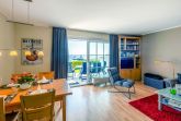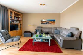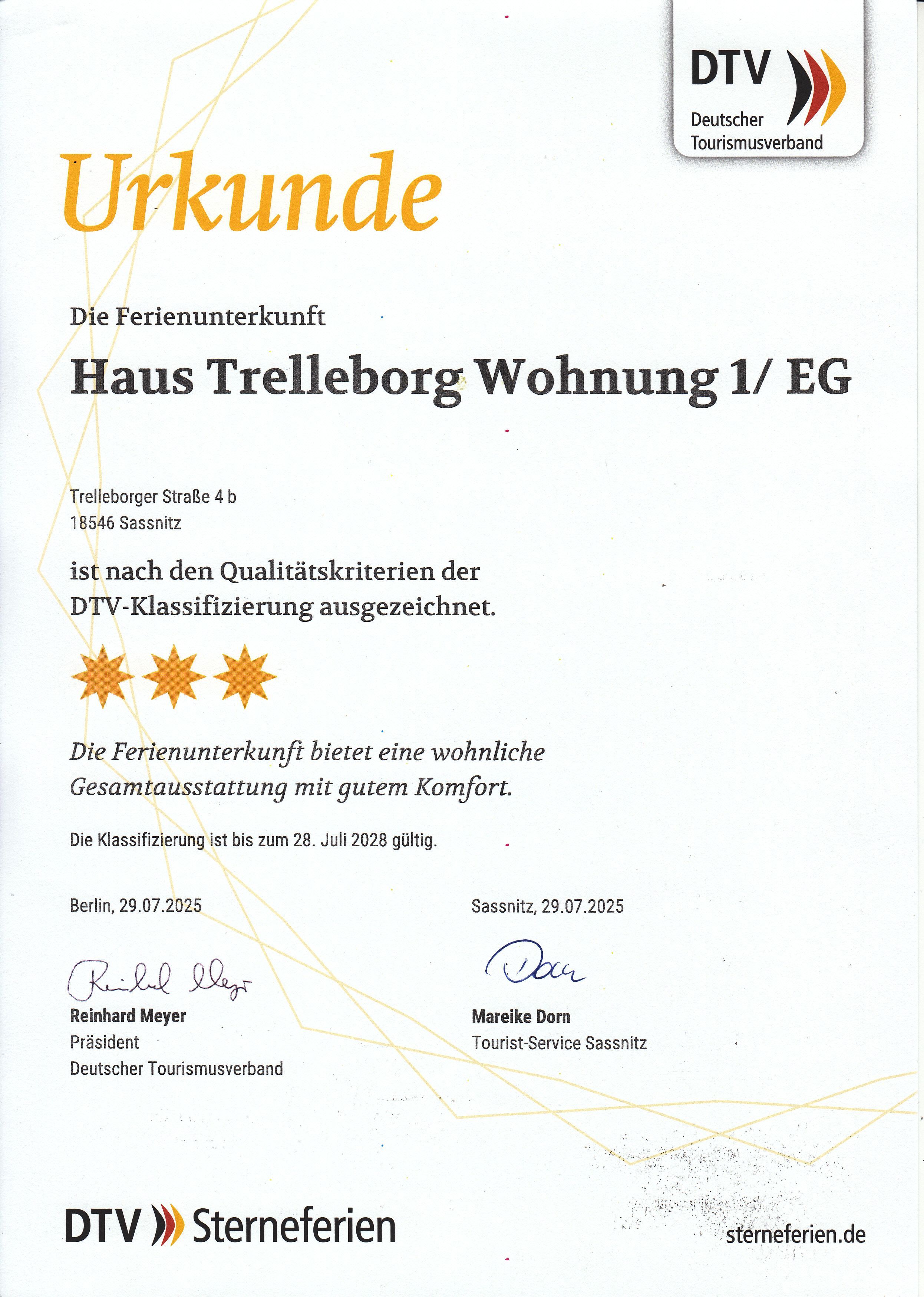Die 55 m ² große und mit DTV Sternen klassifizierte Ferienwohnung 1 befindet sich auf der rechten Seite im Erdgeschoss im Ferienhaus Trelleborg. Sie bietet mit ihren drei Zimmern ausreichend Platz für bis zu 5 Personen.