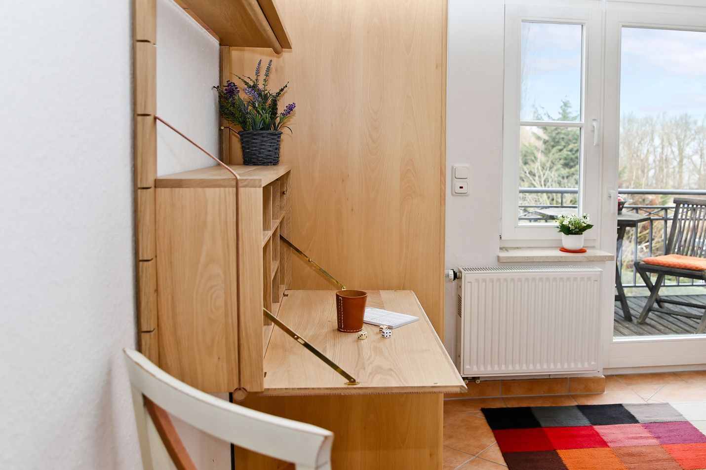 Den überdachten Stellplatz Nr. 19 direkt hinter dem Haus, können Sie bei Bedarf nutzen (max. Einstellhöhe 2 m). Die Loggia nach Osten lädt Sie zum Frühstück beim Sonnenaufgang ein.