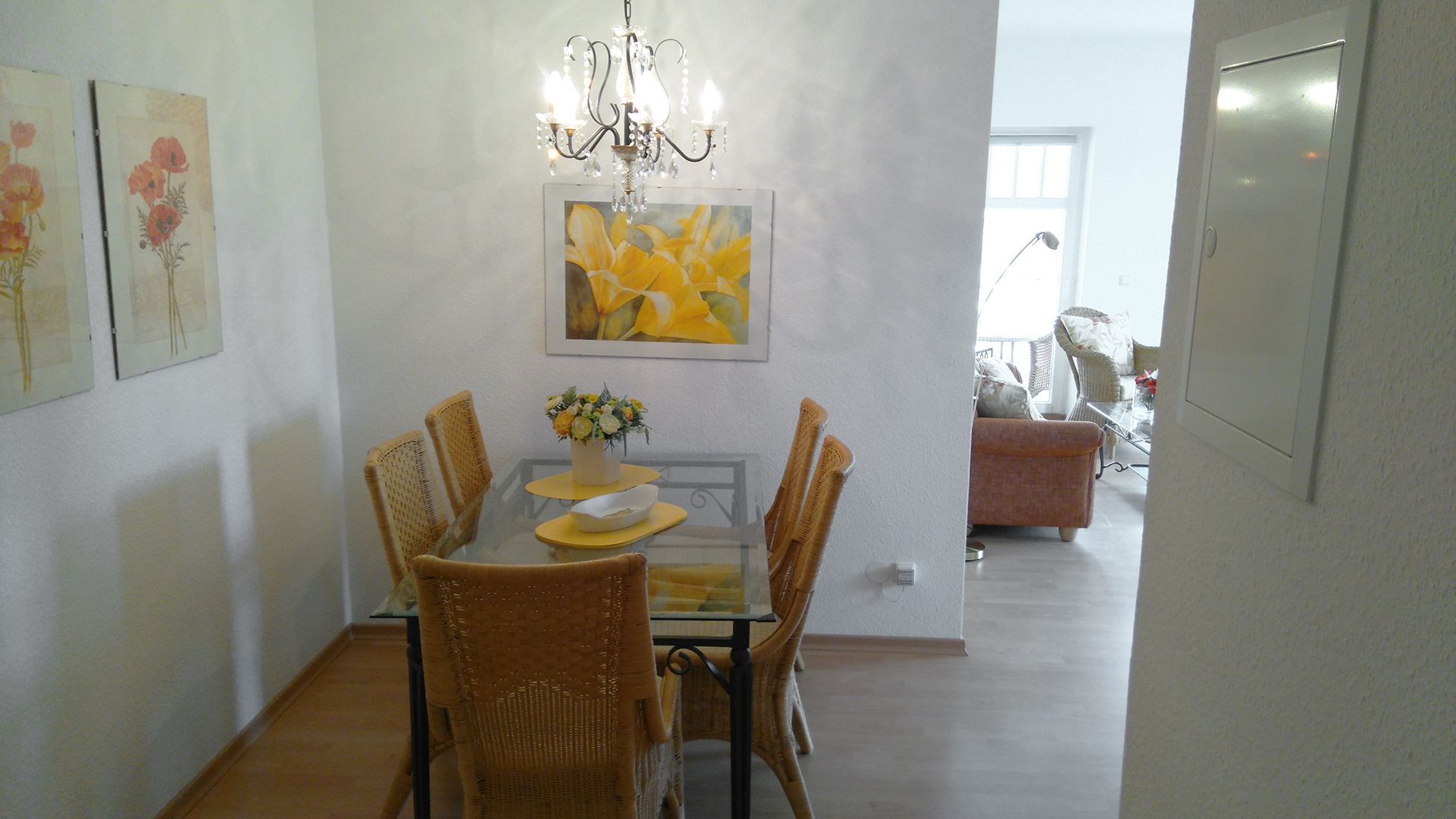 Der ansprechende helle Wohnbereich mit Zugang zu beiden Balkons verfügt über eine Sitzgruppe mit Flachbildschirm und Hifi-Anlage, um einen erlebnisreichen Urlaubstag entspannt ausklingen zu lassen. Angrenzend befindet sich der Essbereich mit einem Tisch für 4 -6 Personen mit moderner komplett ausgestatteter Pantryküche inklusive Geschirrspüler und Ceranherd mit Backofen.