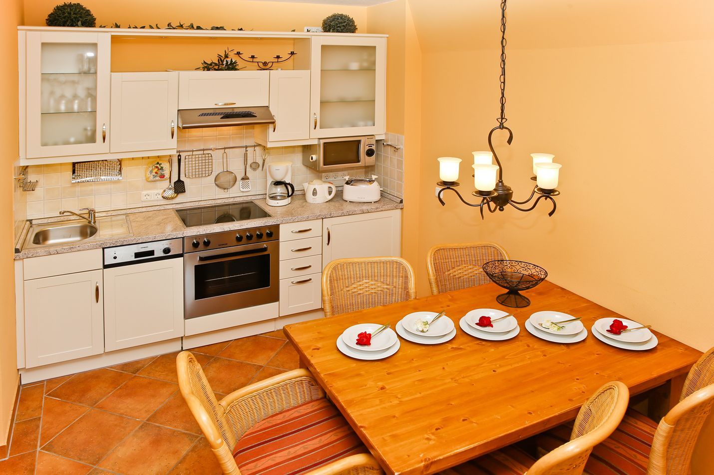 Der moderne Wohnbereich ist luxuriös eingerichtet mit Sitzgruppe, TV und Hifi-Anlage sowie einem Esstisch. Die komfortable Küche mit 4-Platten-Ceranfeld, Geschirrspüler, Mikrowelle und Backofen ist im Wohnbereich integriert.