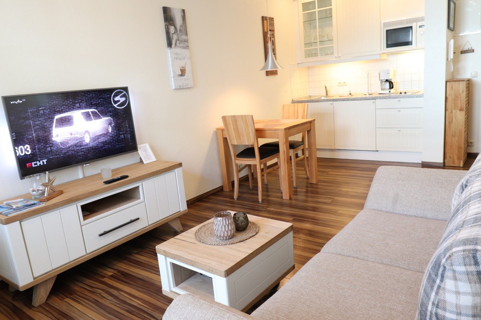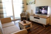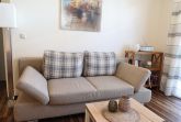 Die gemütliche 2-Raum-Wohnung ist hell und freundlich eingerichtet für 2 Personen mit einem Wohnbereich mit Sitzgruppe (inkl. Schlafcouch), TV und Hifi-Anlage.