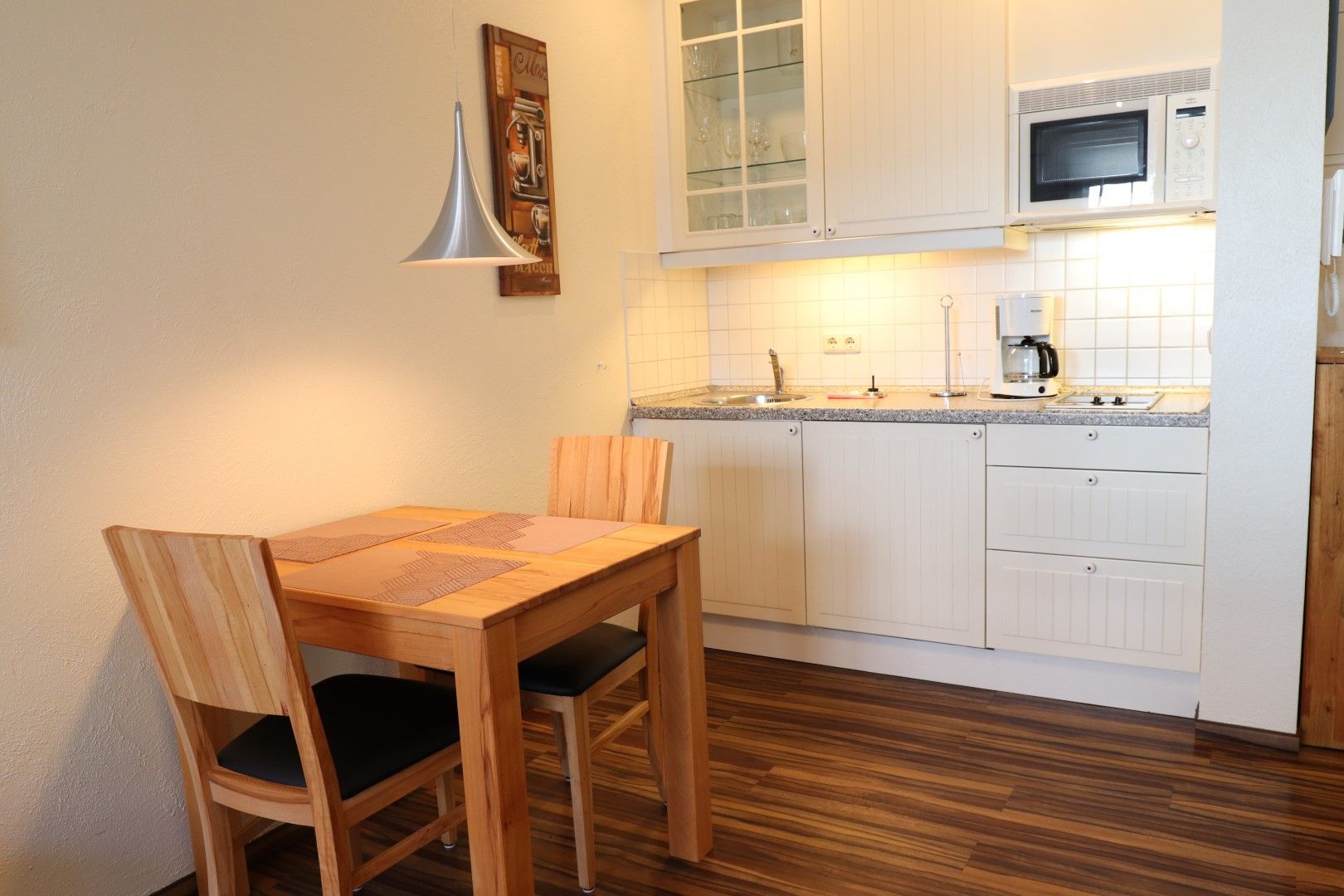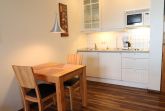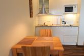 Die Küchenzeile mit Mikrowelle ist im Wohnbereich integriert.