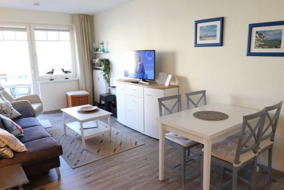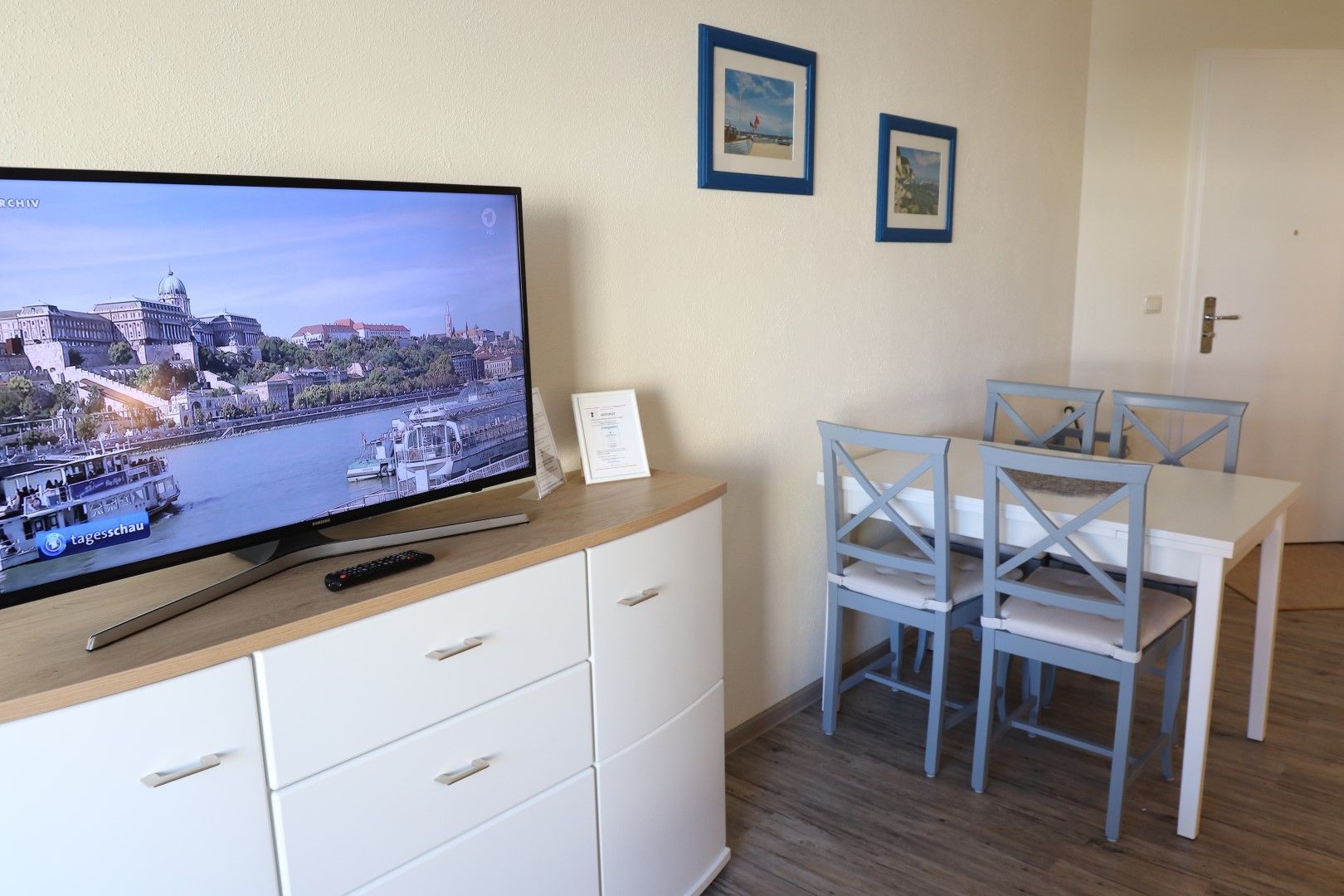 Das Wohnzimmer ist mit Schlafcouch, Eßecke, Flachbildfernseher sowie Radio/CD ausgestattet.