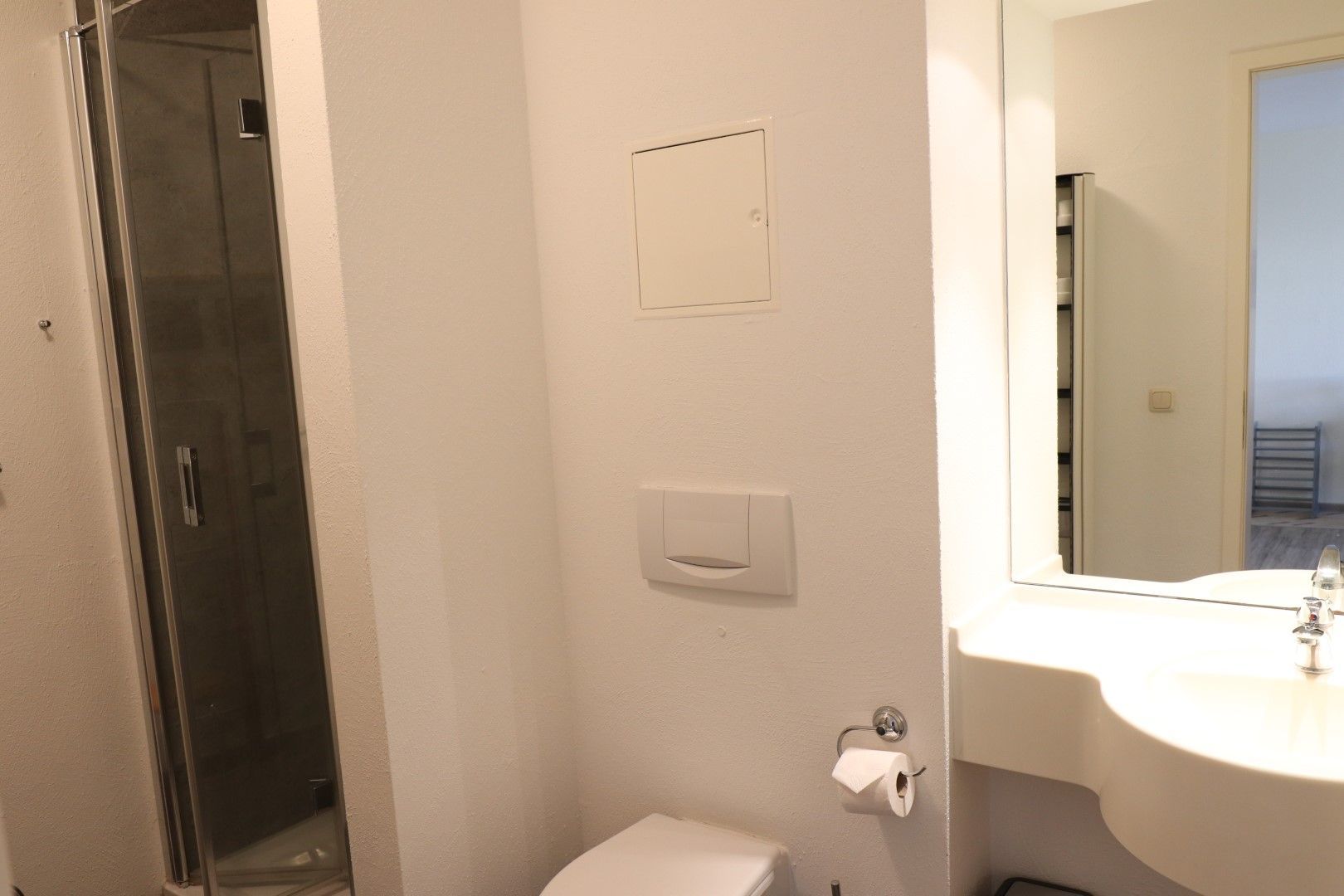 Das Bad ist mit Dusche, WC und Waschtisch ausgestattet. Der Balkon ist mit einem Tisch und zwei Stühlen möbliert.