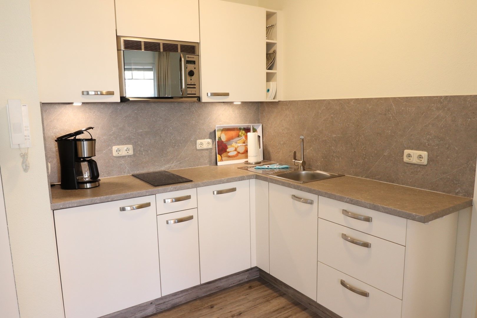 Die offene Küchenzeile enthält Kochfeld, Geschirrspüler, Mikrowelle, Kühlschrank mit Gefrierfach, Kaffemaschine, Wasserkocher und Toaster. Im Schlafzimmer befinden sich ein Doppelbett und ein Kleiderschrank.
