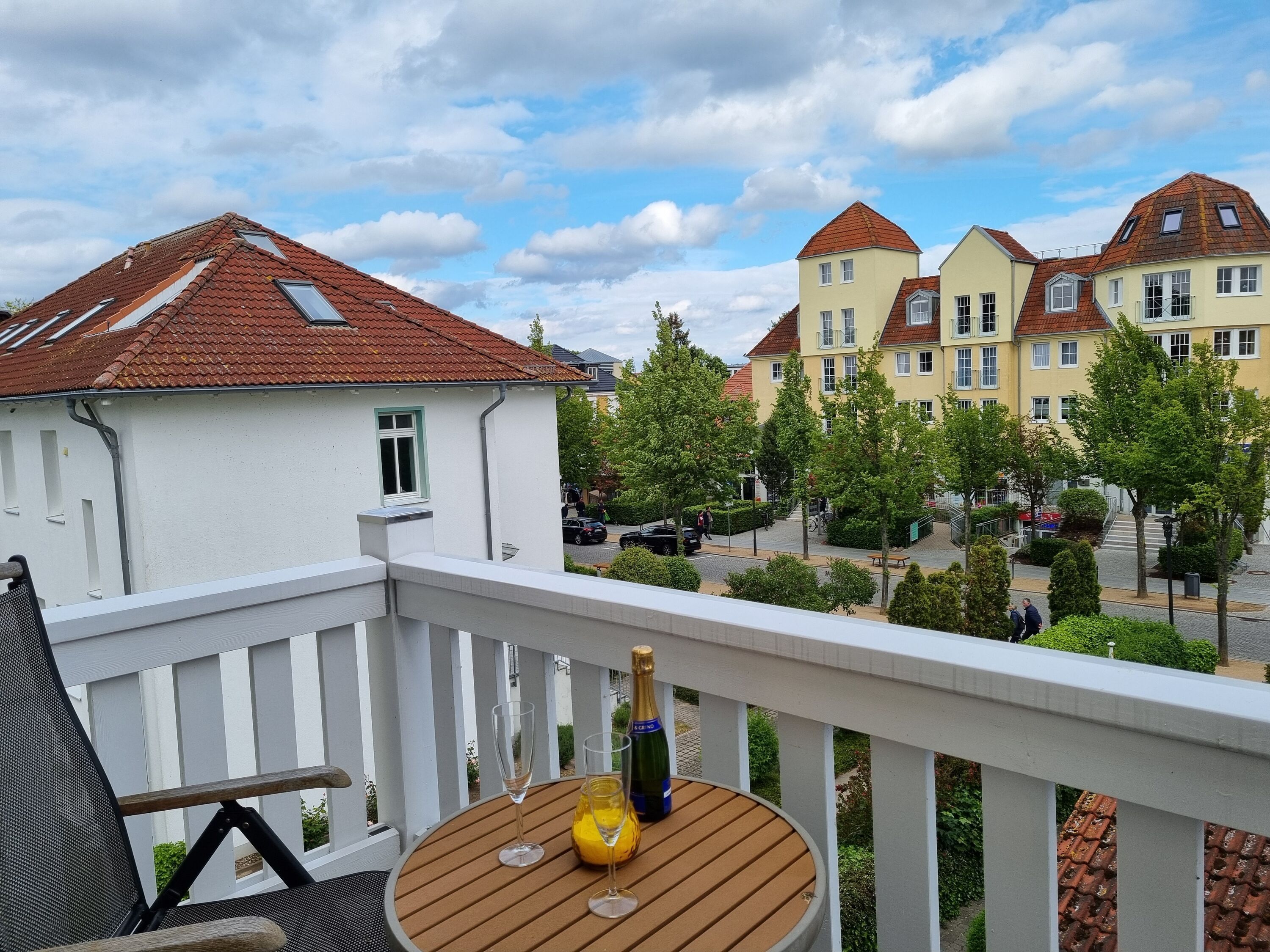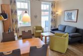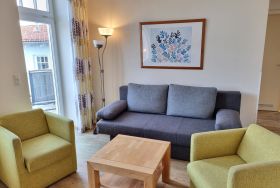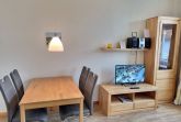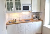 Hell und freundlich eingerichtet bietet die Wohnung einen Wohnbereich mit Sitzgruppe (inkl. Schlafcouch), TV und Hifi-Anlage. Die Küchenzeile mit Mikrowelle ist im Wohnbereich integriert.