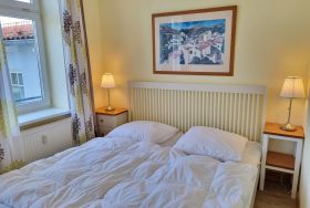 Das Schlafzimmer bietet ein Doppelbett. Im Bad/WC befindet sich eine Dusche.