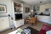 Das Schlafzimmer mit Doppelbett bietet zwei Schlafmöglichkeiten. Der Wohnbereich ist mit einer Einzelschafcouch und einem Esstisch eingerichtet. Im Wohnbereich ist eine Pantryküche mit Mikrowelle integriert. Ein Bad/WC mit Dusche ergänzt die