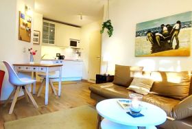 Im Wohnbereich integriert ist eine Pantryküche mit 2-Platten Ceran-Kochfeld, Mikrowelle und selbstverständlich einem Geschirrspüler, damit Sie im Urlaub Ihr Geschirr nicht selbst abzuwaschen brauchen.