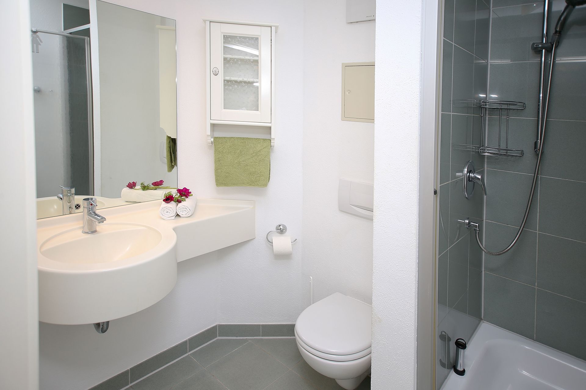 Ein Bad/WC mit Dusche ergänzt die Wohnung, wie ein kleiner Abstellraum für Schuhe, Koffer und Vorräte.