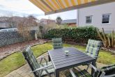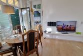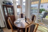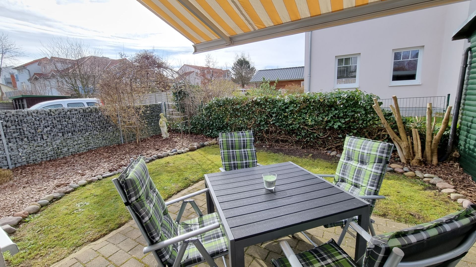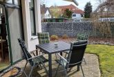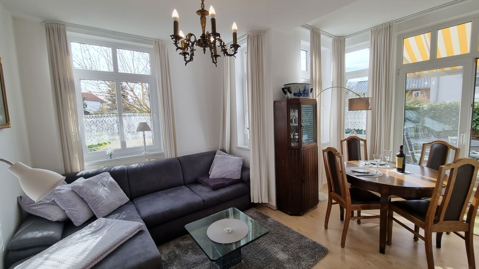 Der Wohnbereich mit Süd-Terrasse ist eingerichtet mit einer Sitzgruppe und Esstisch, das Schlafzimmer verfügt über ein Doppelbett.