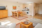 Die großzügige 3-Zimmer-Fewo befindet sich in Hochparterre. Die Wohnung ist ca. 60 m² groß und für bis zu 4 Personen eingerichtet. Im großen Schlafzimmer finden Sie ein Doppelbett (1,60 m breit, durchgehende Matratze). Das 2. Schlafzimmer ist mit einem Etagenbett ausgestattet. Der Wohnbereich verfügt über eine Sitzgruppe und Esstisch sowie eine Couch.