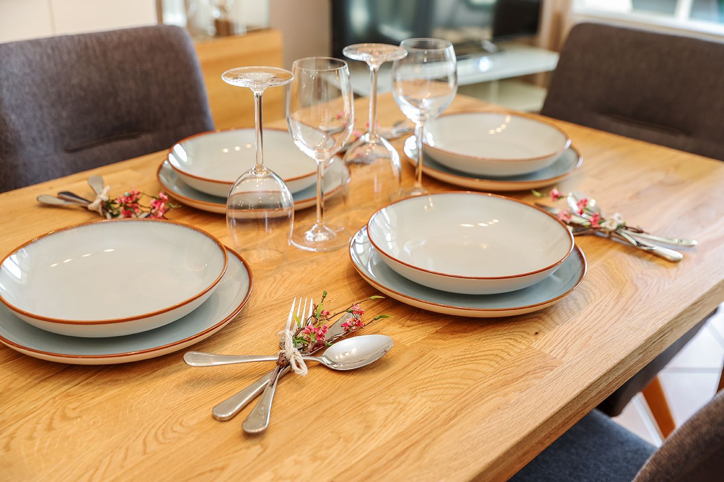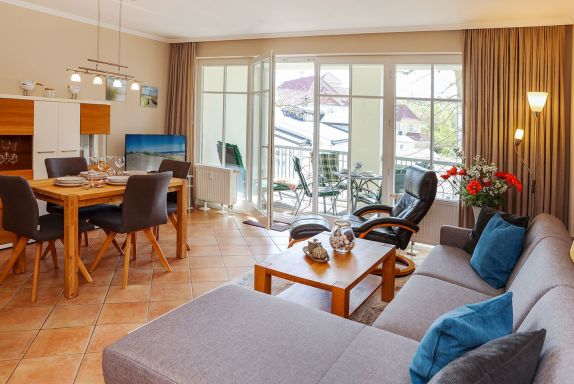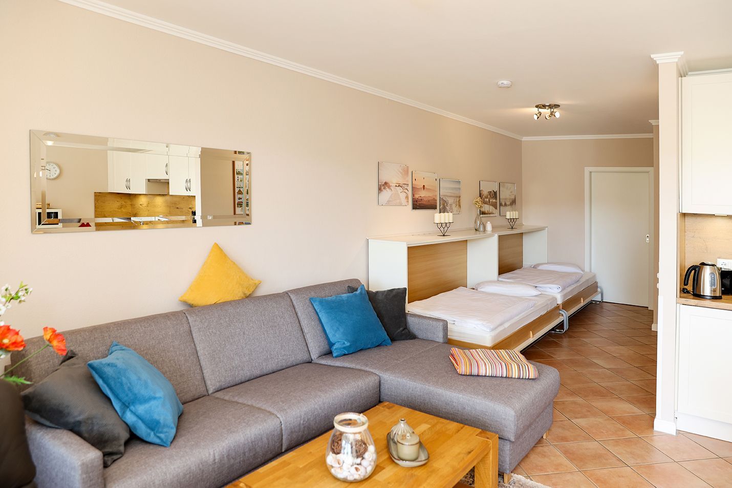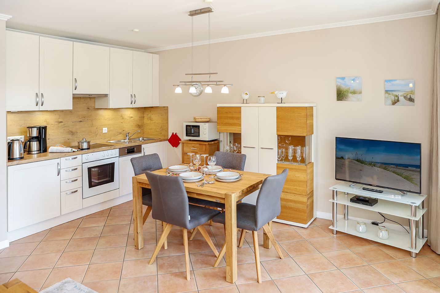 Zusätzlich finden Sie im Wohnbereich eine Sitzgruppe mit Esstisch.