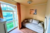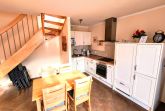 Im Obergeschoss befindet sich eine offene Galerie mit Doppelbett (1,60 m breit) und ein abgeschlossenes Schlafzimmer mit Doppelschlafcouch 1,40 m. Die Schlafzimmer haben Vinylboden, das Untergeschoss hat Fliesenfußboden.