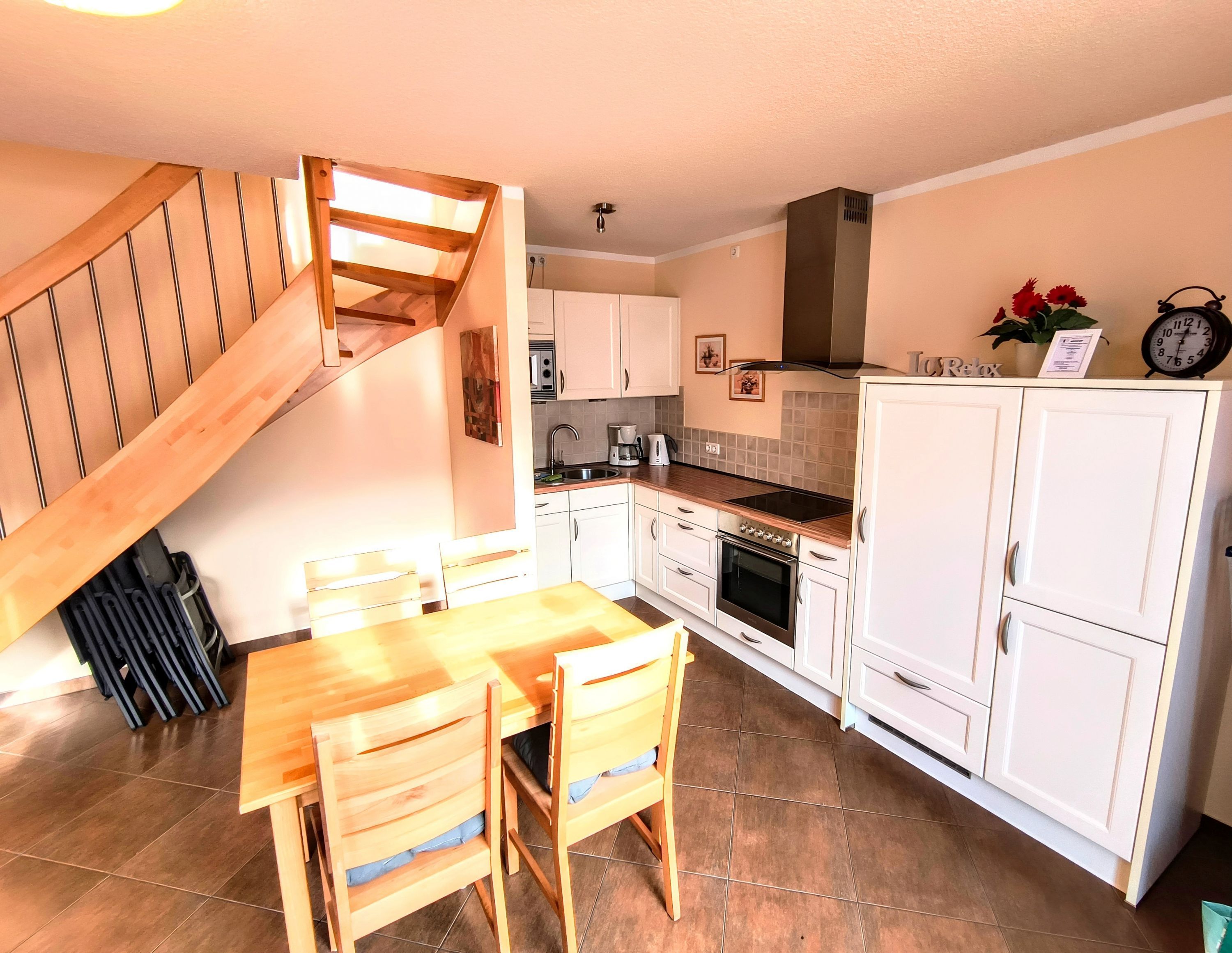Der Wohnbereich ist eingerichtet mit einer Ecksitzgruppe mit Schlaffunktion und einer modernen Einbauküche mit Geschirrspüler, Mikrowelle und 4-Platten-Herd mit Backofen.