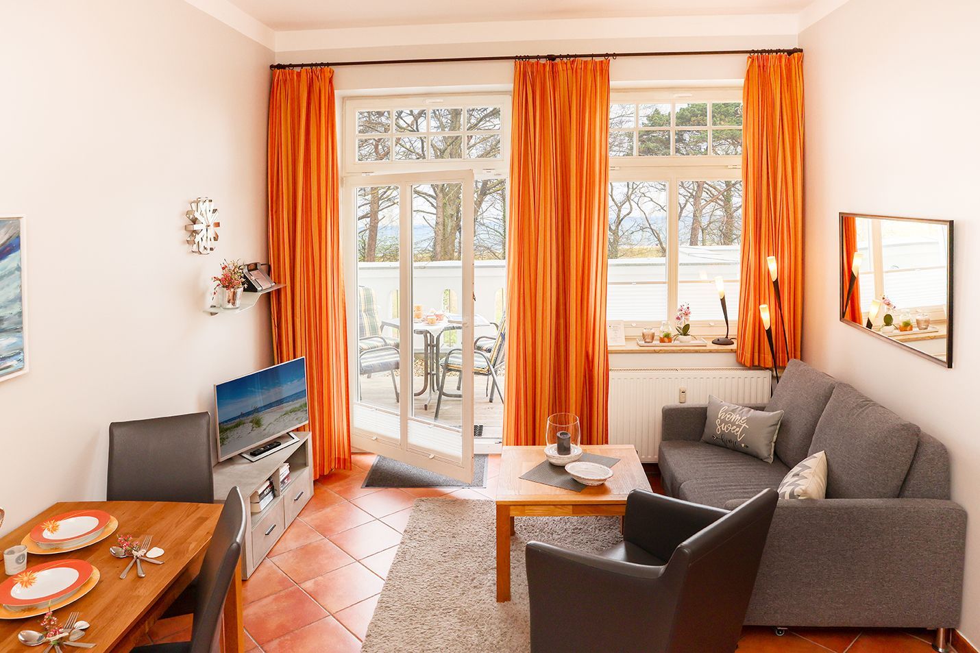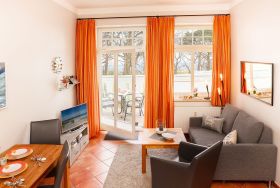 Im Wohnbereich stehen ihnen die Couch sowie ein gemütlicher Sessel als Sitzgelegenheit zur Verfügung.