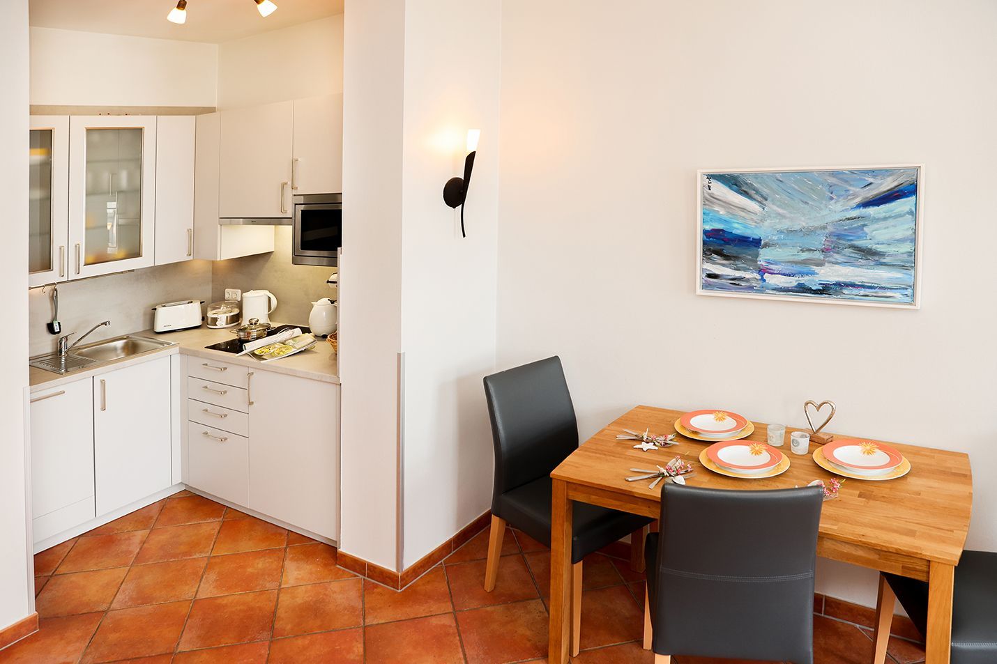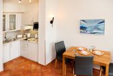 Die moderne Einbauküche mit Geschirrspüler, Mikrowelle sowie einem 2-Platten-Ceranfeld ist im Wohnbereich integriert. Am gemütlichen Esstisch mit 3 Stühlen können Sie ihre Mahlzeiten einnehmen.