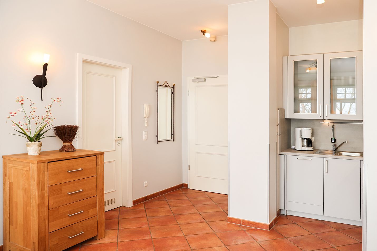 Der Eingang, Küchenbereich und das Wohnzimmer sind ebenfalls gefliest, das Schlafzimmer ist mit Laminat ausgelegt.