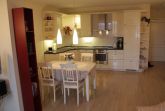 Die moderne großzügige offene Alno Einbauküche mit einer Marmorplatte, Backofen und Geschirrspüler sowie der stilvolle Essplatz bieten allen Komfort.