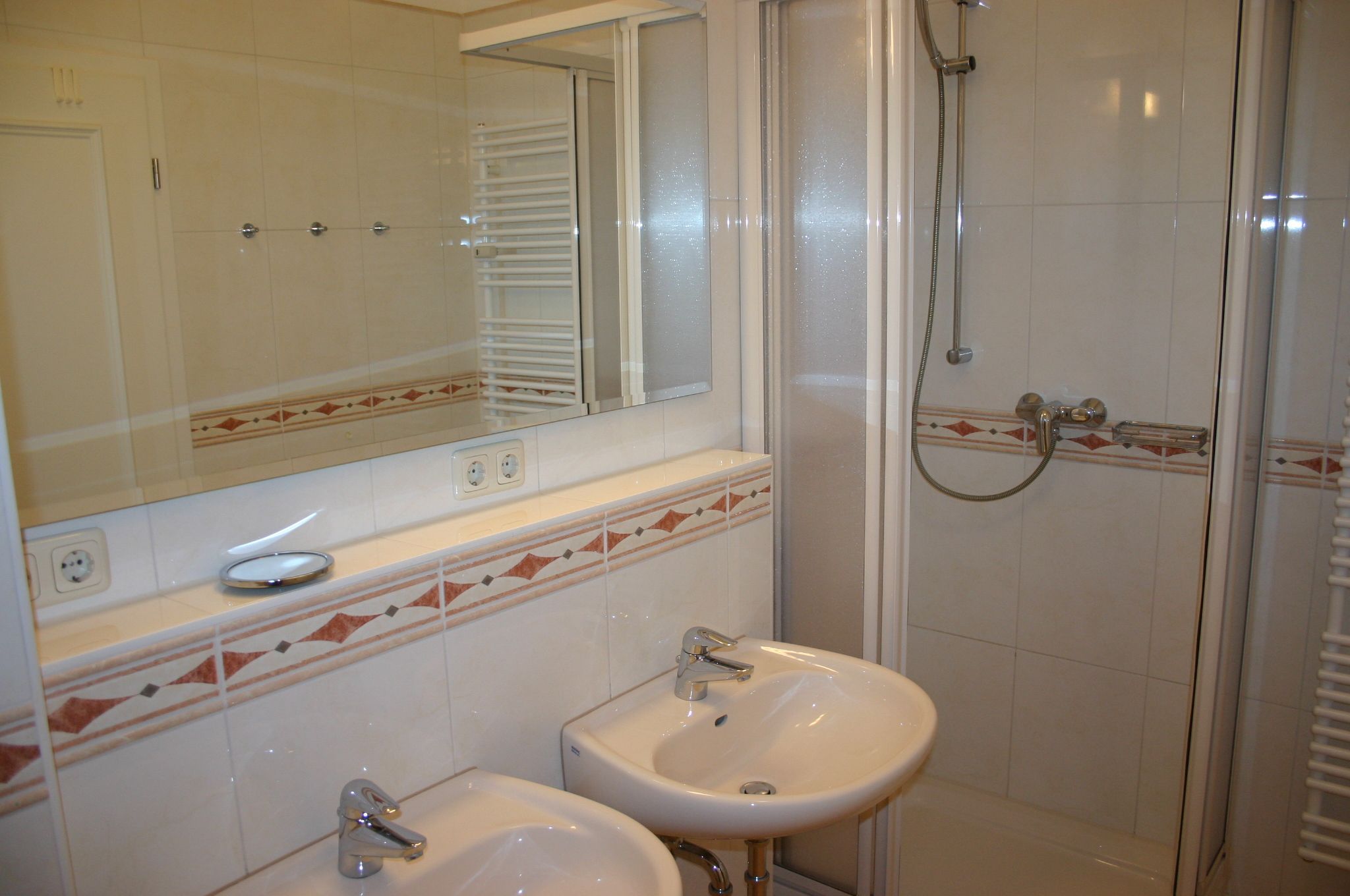 Das schöne Duschbad mit WC hat eine Fußbodenheizung, zwei Waschbecken und genug Ablagefläche für alle Badeartikel.