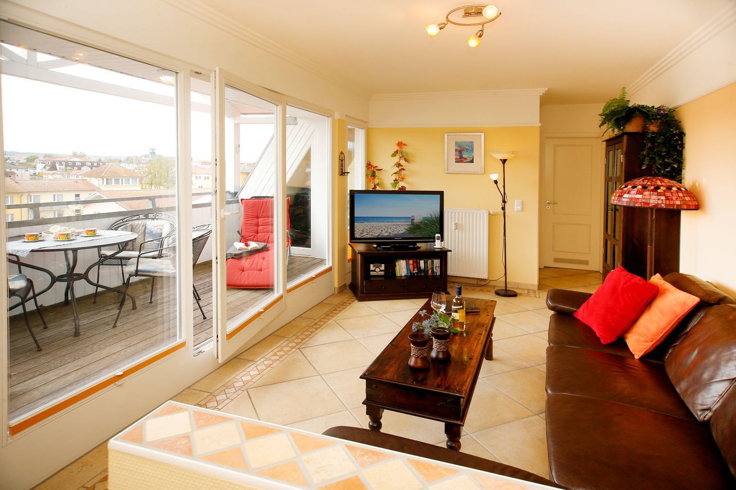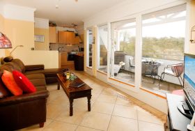 Im Wohnzimmer können Sie auf einer bequemen, ausziehbaren Couch den Abend ausklingen lassen.