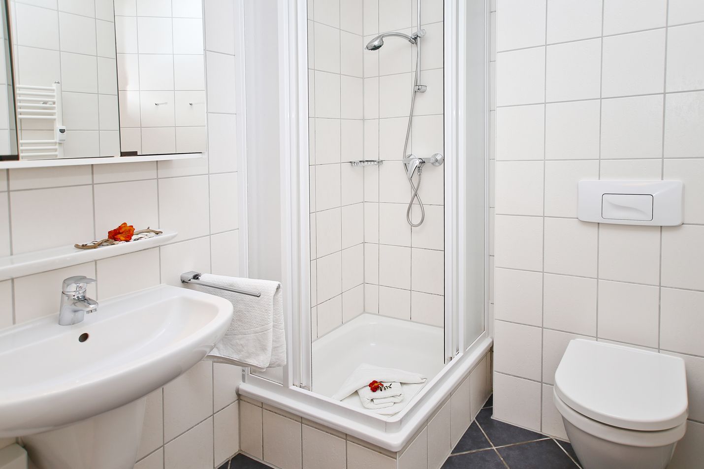 Das Duschbad/WC ergänzt die Ferienwohnung. Die komplette Wohnung ist mit Laminat ausgelegt.