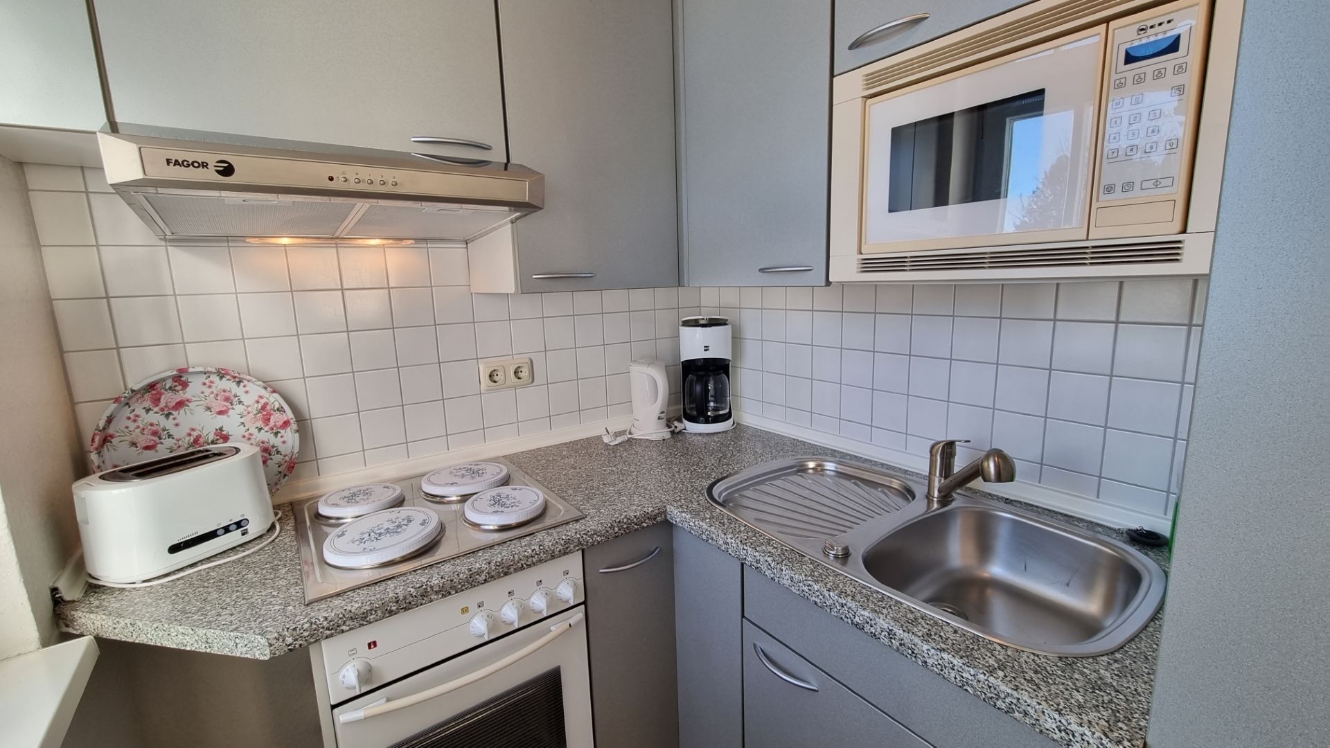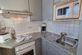 Die Pantryküche mit Mikrowelle und Backofen ist im Wohnbereich integriert.