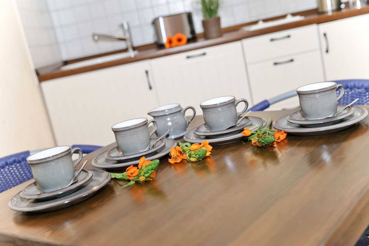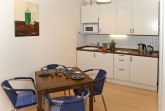Etwas seperat vom Wohnbereich befindet sich die voll ausgestattete Küche mit Herd, Mikrowelle und Geschirrspülmaschine sowie der Esstisch.
