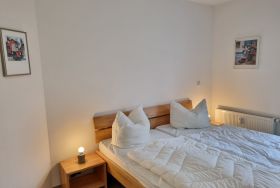 Das Schlafzimmer ist ausgestattet mit einem Doppelbett und Allergikerbetten. Ein Duschbad/WC ergänzt die Ferienwohnung.