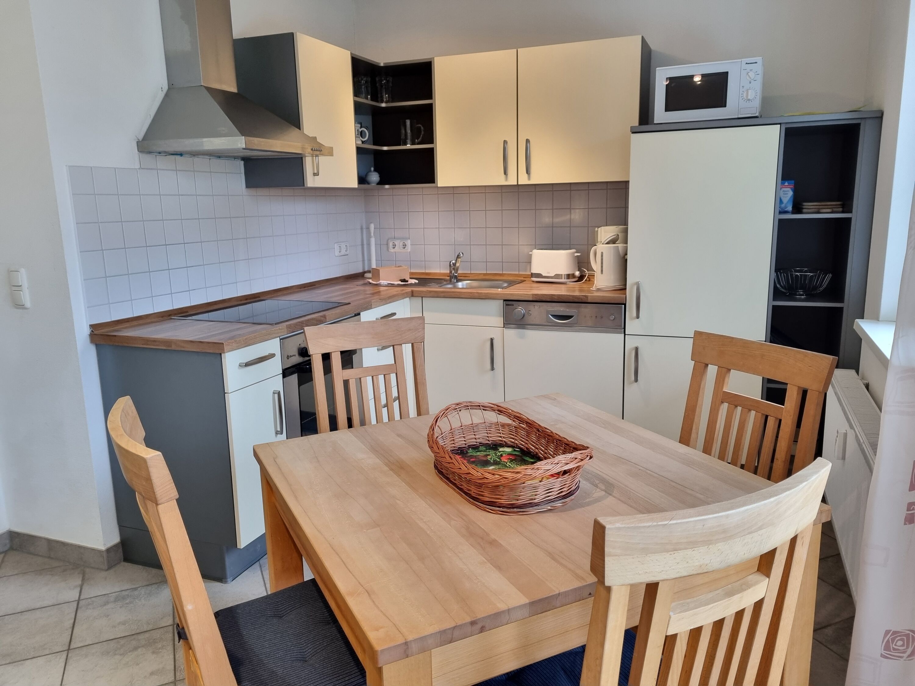 Die moderne Markeneinbauküche mit 4-Fach Ceranfeld, Backofen, Geschirrspüler und Mikrowelle ist im Wohnbereich integriert.