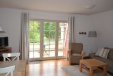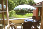 Auf dem großen Balkon der Wohnung können Sie bequem zu Viert sitzen. Von dort aus haben Sie einen herrlichen Blick in den Baltic – Park und einen seitlichen Blick auf die Ostsee.