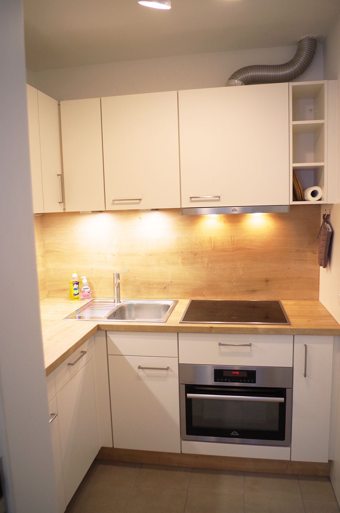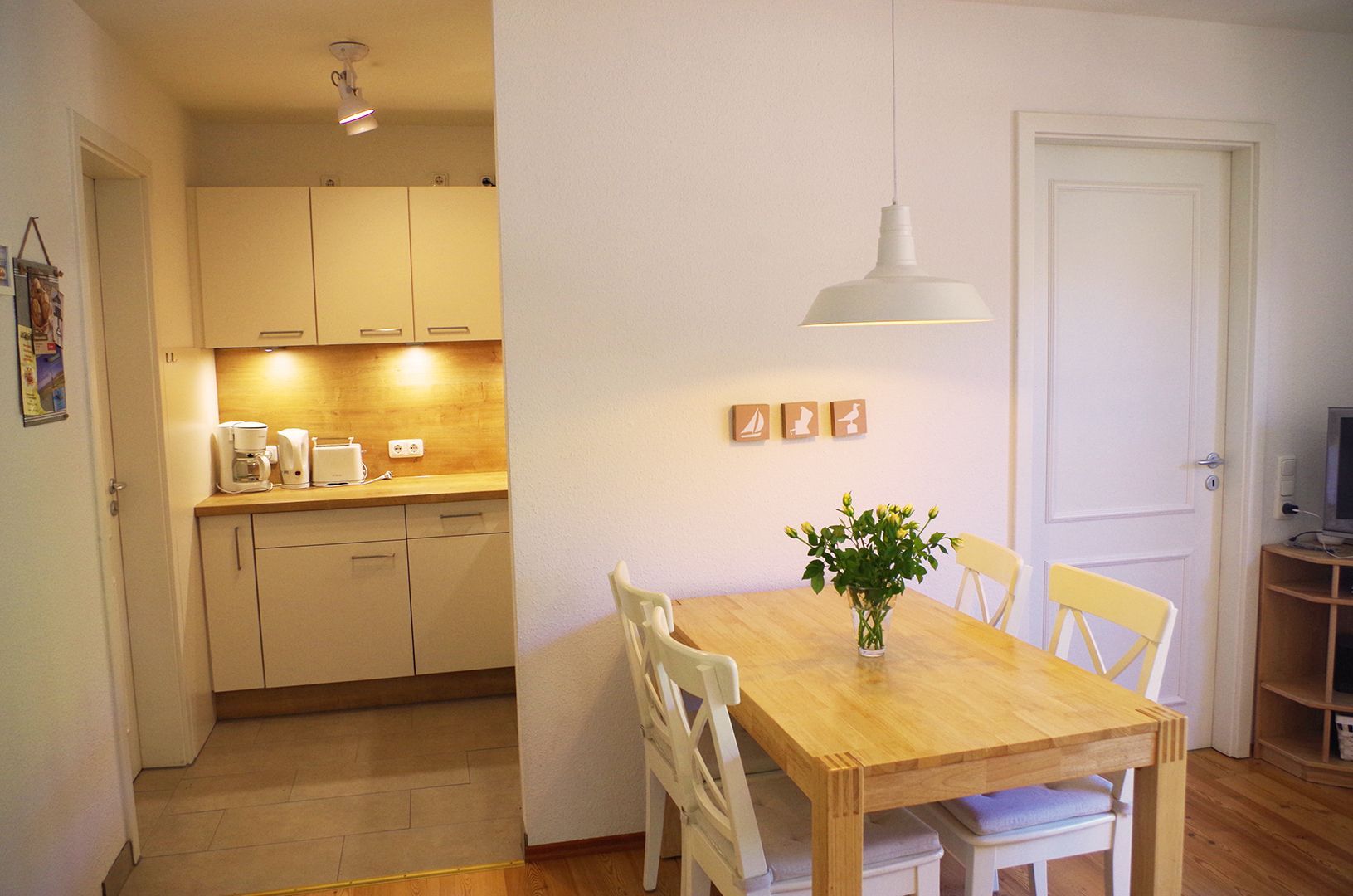 Die Einbauküche (mit Geschirrspüler, Mikrowelle, Wasserkocher, Toaster, Kaffeemaschine, Backofen und 4-Platten-Ceranfeld) ist - optisch getrennt - ebenfalls in den Wohnbereich integriert.