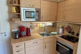 Die Einbauküche mit Geschirrspüler, Mikrowelle, Backofen und 4-Platten-Ceranfeld ist, optisch getrennt, ebenfalls in den Wohnbereich integriert.