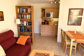 Im Wohnbereich befindet sich eine Sitzgruppe mit Couch und Sesseln, Hifi-Anlage und mit LCD-TV sowie ein Esstisch.