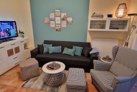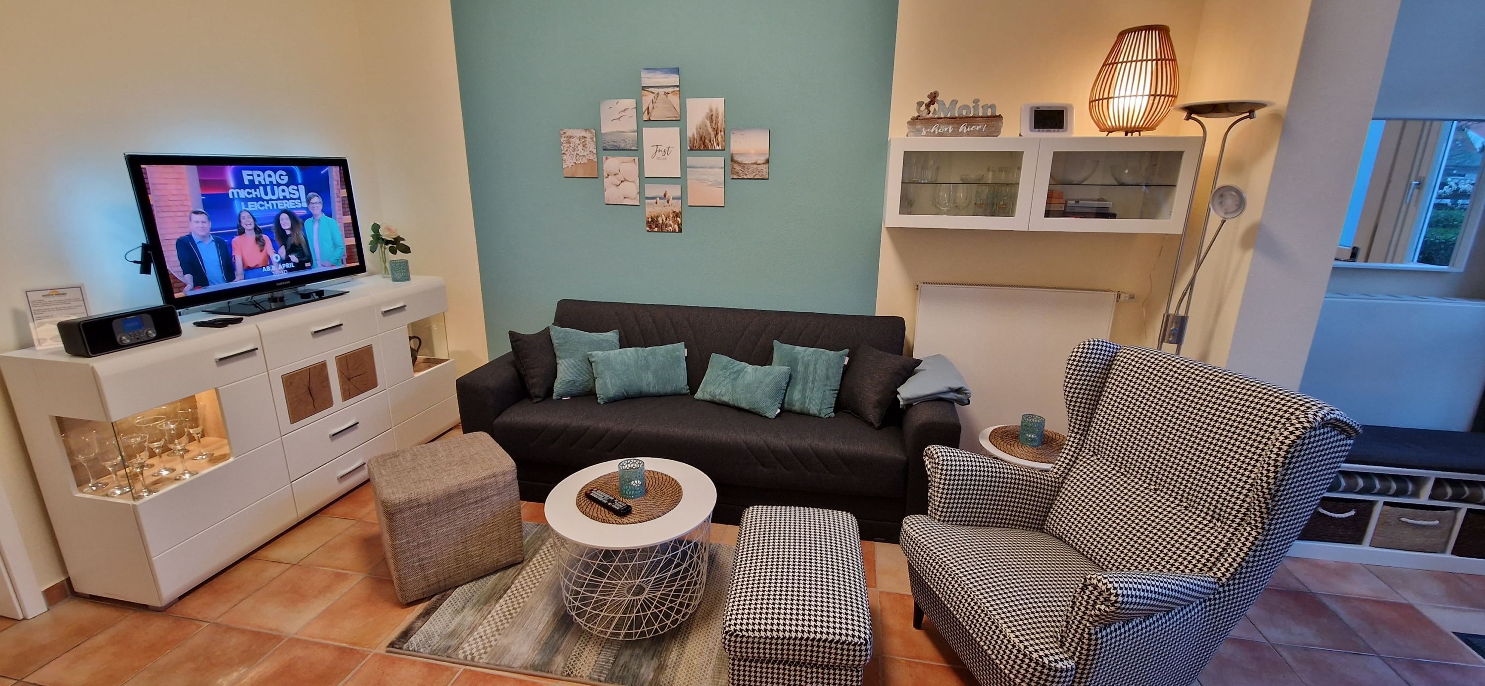 Der Wohnbereich ist mit einem großen Sofa, einem bequemen Sessel, einem Flachbildfernseher, Internet-Radio und WLAN ausgestattet. Außerdem sind einige Gesellschaftsspiele und Bücher vorhanden.