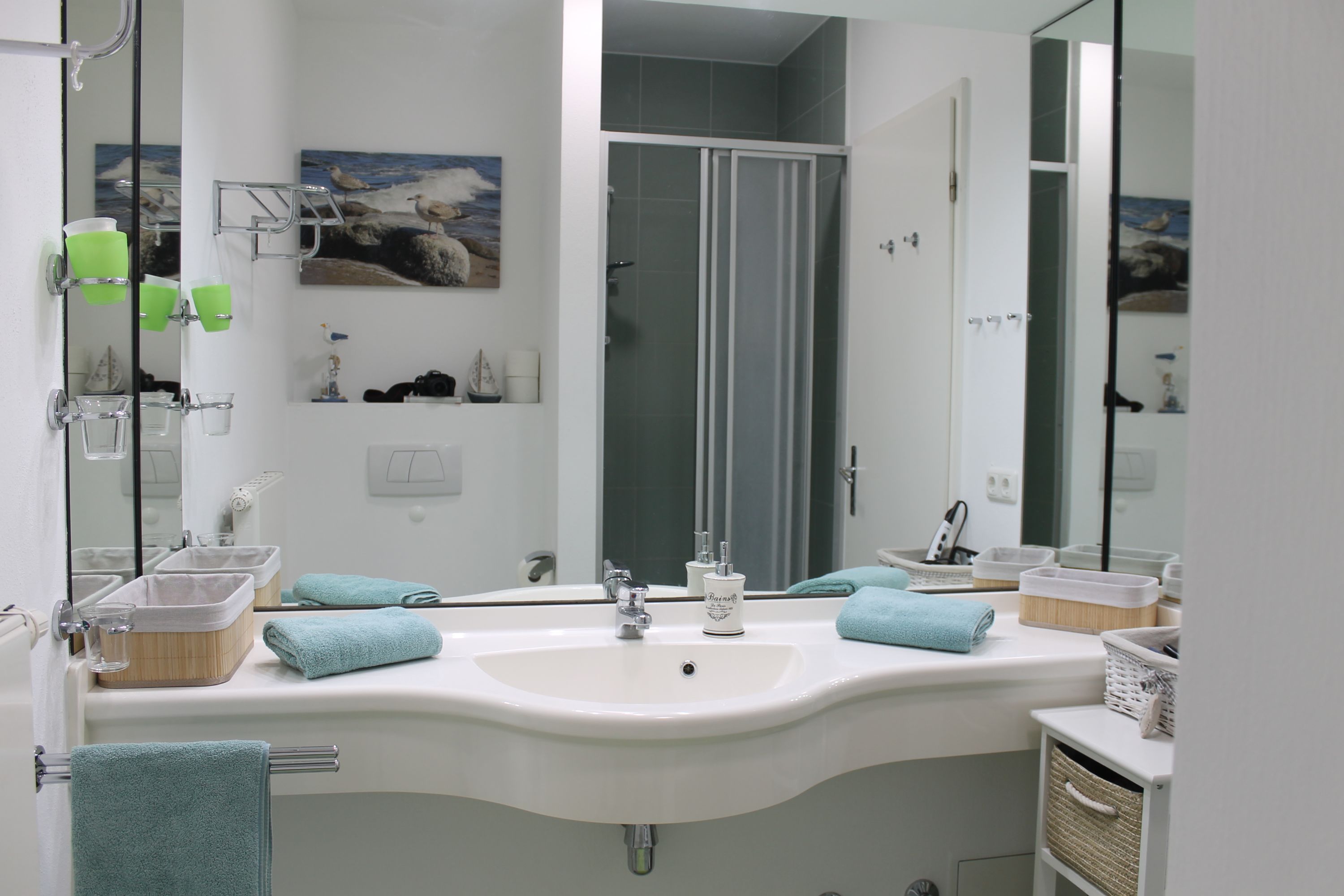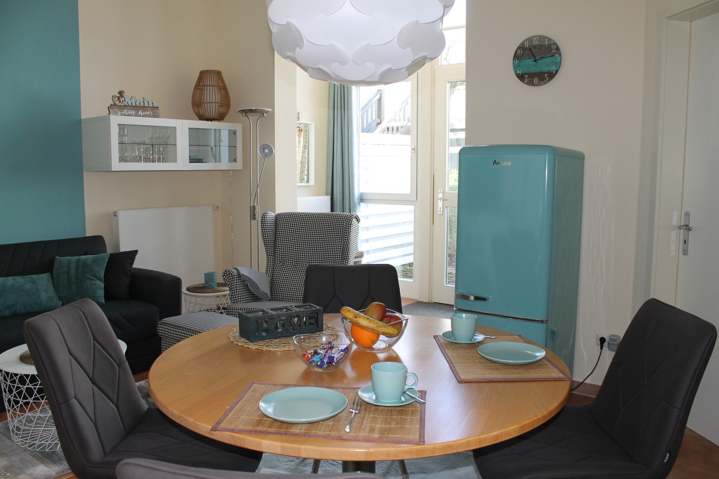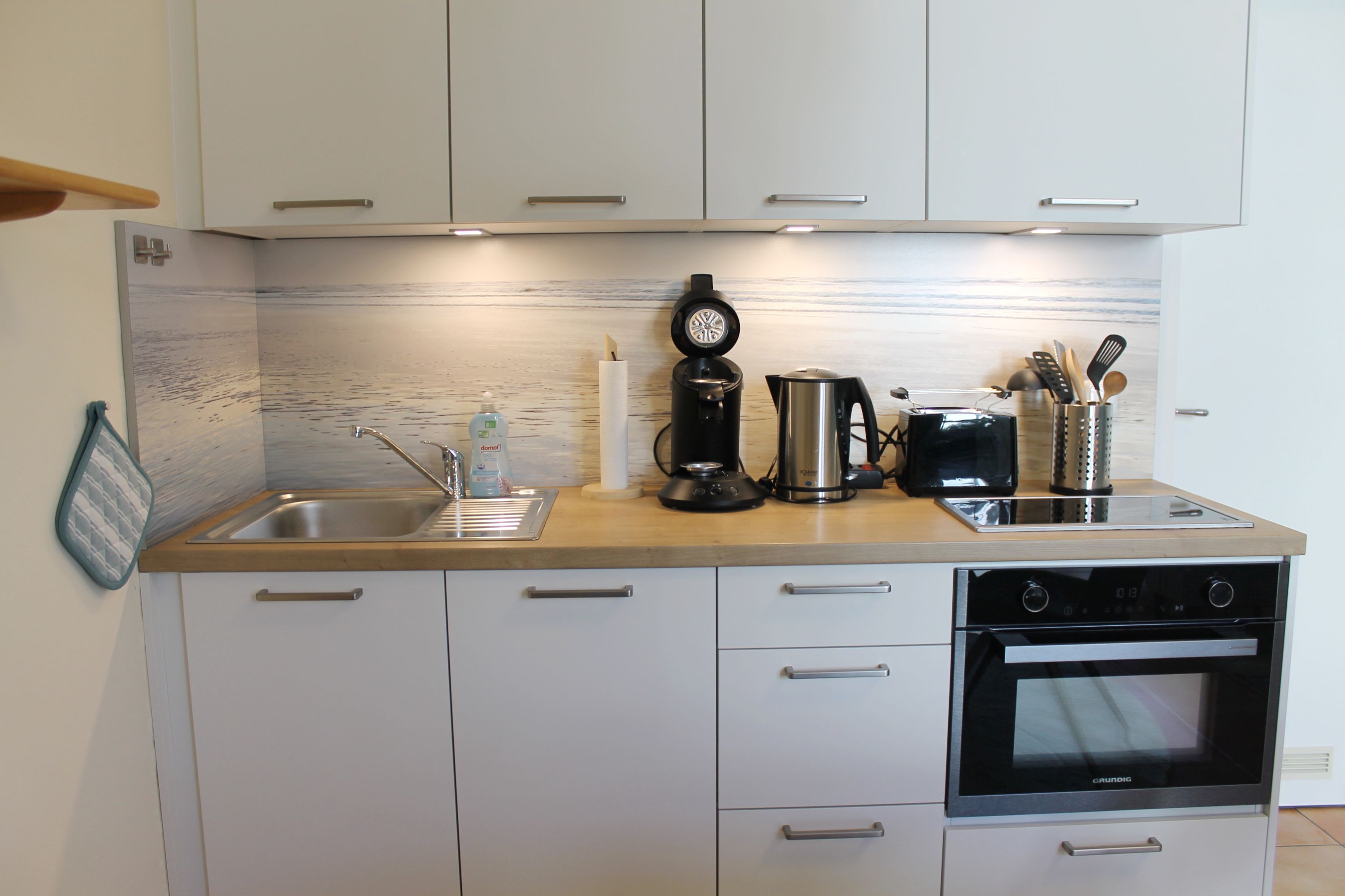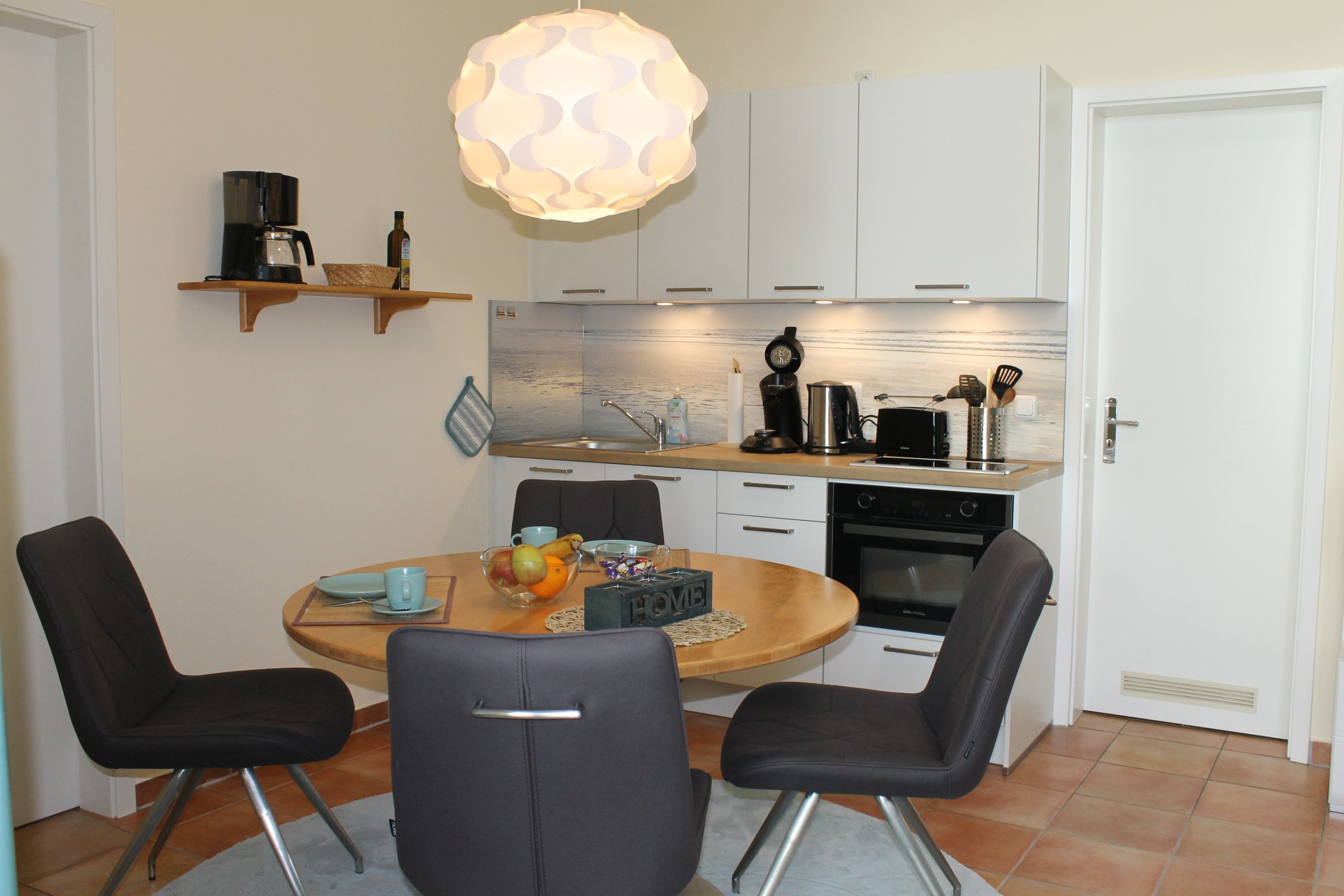 Die Wohnung verfügt über eine neue Küchenzeile mit einem Geschirrspüler, einem 2-Platten-Ceranfeld und einem Backofen mit integrierter Mikrowelle. Ebenfalls zur Ausstattung gehören ein Toaster, Wasserkocher, Eierkocher, Kaffeemaschine und eine zusätzliche Senseo Kaffeepadmaschine. Auch ein separater Kühl-/Gefrierschrank steht zur Verfügung. Die Mahlzeiten können an einem großen runden Tisch eingenommen werden, an dem 5 Stühle bereitstehen.
