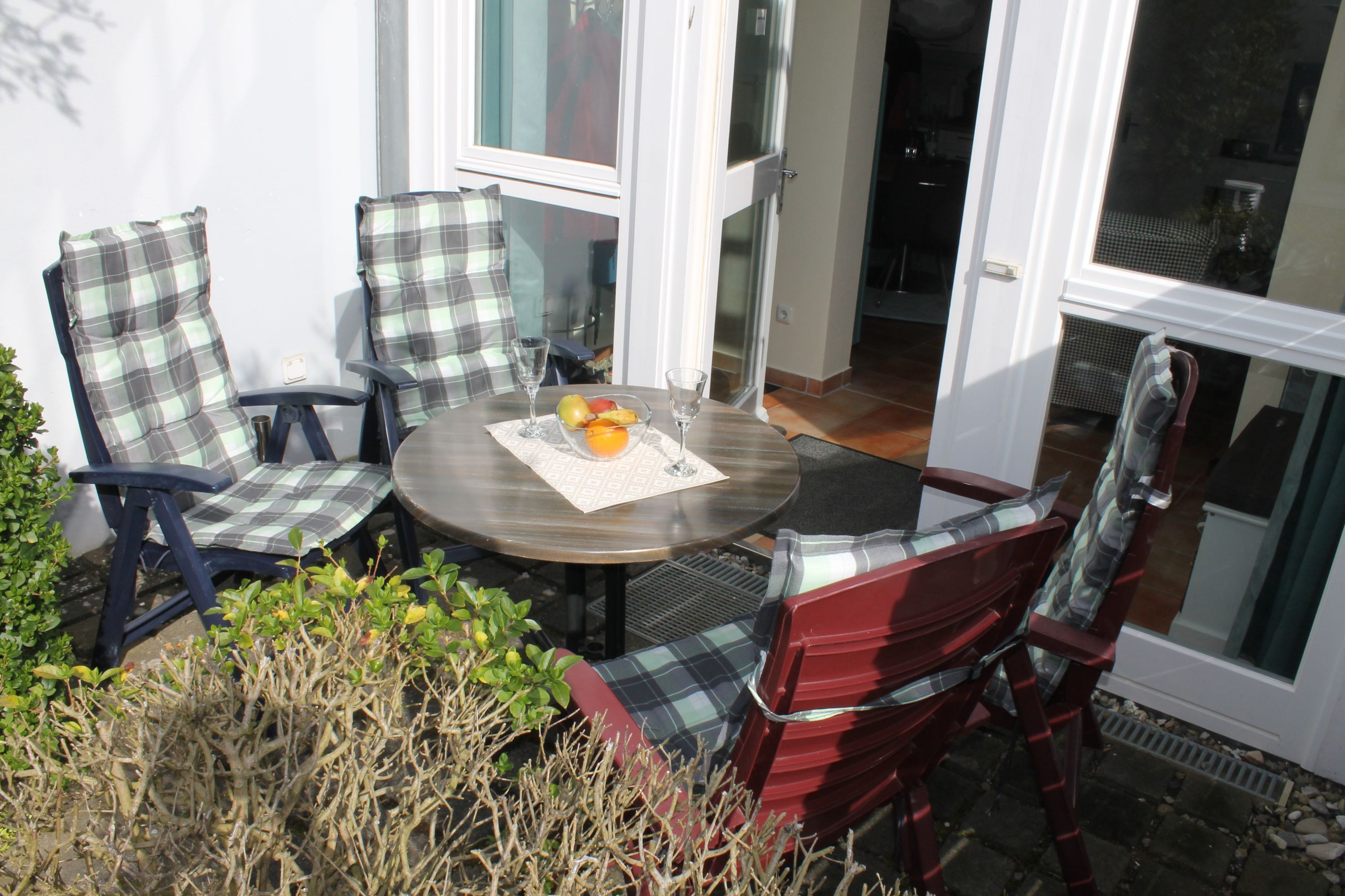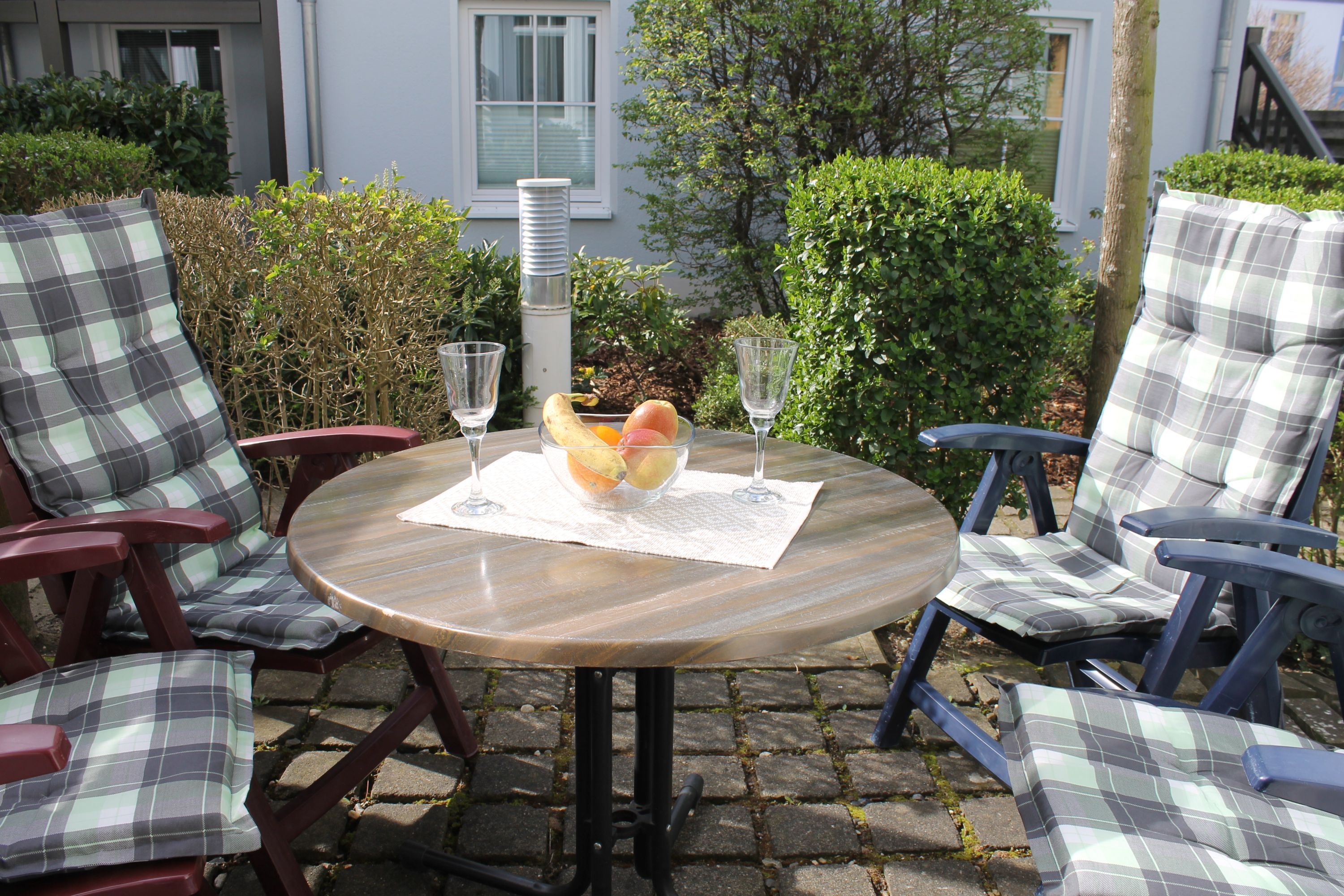 Die nach Westen ausgerichtete Terrasse ist mit einem runden Tisch, 4 Gartenstühlen und einem Sonnenschirm ausgestattet.
