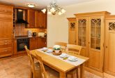 Die Wohnung bietet einen Wohnbereich mit edler Einbauküche mit 4-Platten-Ceranfeld und Backofen sowie einem Geschirrspüler. Am Esstisch können 4 Personen Platz nehmen. Eine Sitzgruppe mit 2 Doppelcouchen ergänzt das mediterrane Wohnzimmer. Zur technischen Ausstattung gehören LCD-TV, DVD-Player, Radio m. CD und MP3-USB-Anschluss.