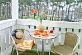 Die 2-Zimmer-Ferienwohnung liegt im 2.OG des Hauses mit einem Balkon zur Nordseite und einem weiteren zur Westseite. Die moderne Ferienwohnung ist ca. 50 m² und bietet für 3 Personen ein Schlafzimmer mit Doppelbett und eine Schlafcouch im Wohnzimmer. Der Wohnbereich ist mit einem Esstisch und einer Sitzgruppe mit Doppelschlafcouch