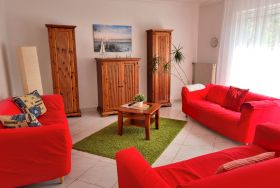 Der großzügige Wohnraum verfügt über eine bequeme Sitz- und Essecke, ein Radio und Farb-Tv, sowie ein Süd/West Balkon.