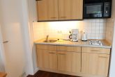 An den Wohn-Schlafbereich grenzt die kleine Küchenzeile. Hier finden Sie einen 2-Platten-Herd, Mikrowelle, Kaffeemaschine, Wasserkocher und natürlich genügend Geschirr.