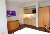 Der Wohn- und Schlafbereich ist mit einer Essecke eingerichtet mit Farb-TV und Hifi-Anlage.