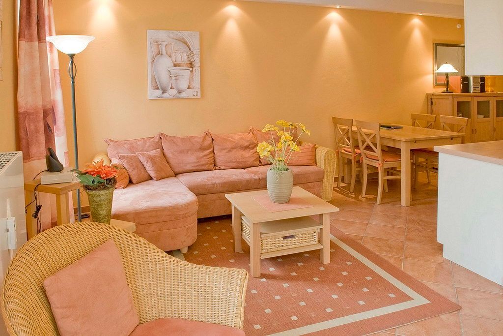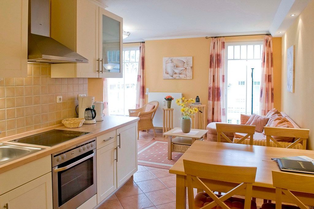 Die 2 Zimmer-Ferienwohnung ist modern im mediteranen Stil eingerichtet und befindet sich im 2.OG des Hauses mit einem Eckbalkon zur Ost- und Südseite. Die offene Küche ist mit 4 Platten Ceran Herd, Backofen, Geschirrspüler, Kaffemaschine, Wasserkocher und Toaster ausgestattet. Appartement ist komplett gefliest.