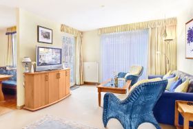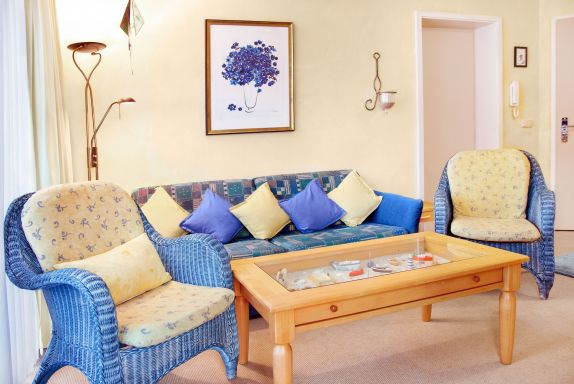 Der Wohnbereich ist mit einer Sitzgruppe ausgestattet und verfügt über den Zugang zu einem der beiden Balkone, welcher der größere der Beiden ist und zur Süd-Seite liegt.
