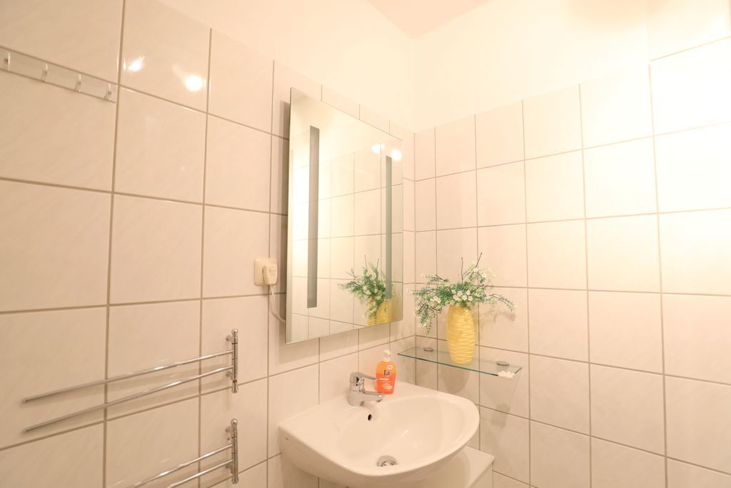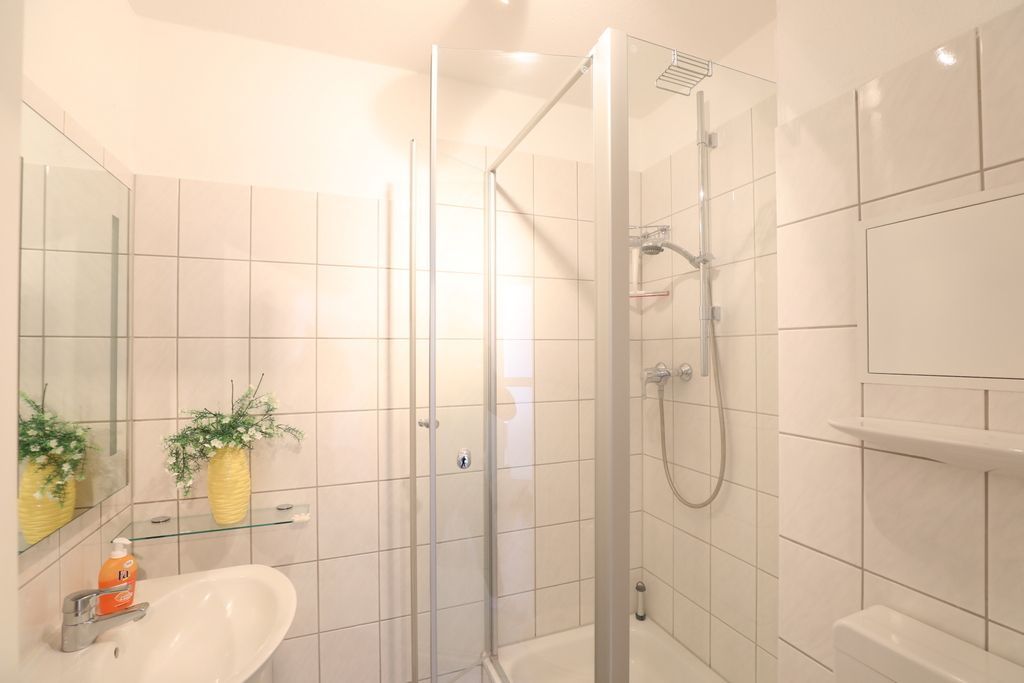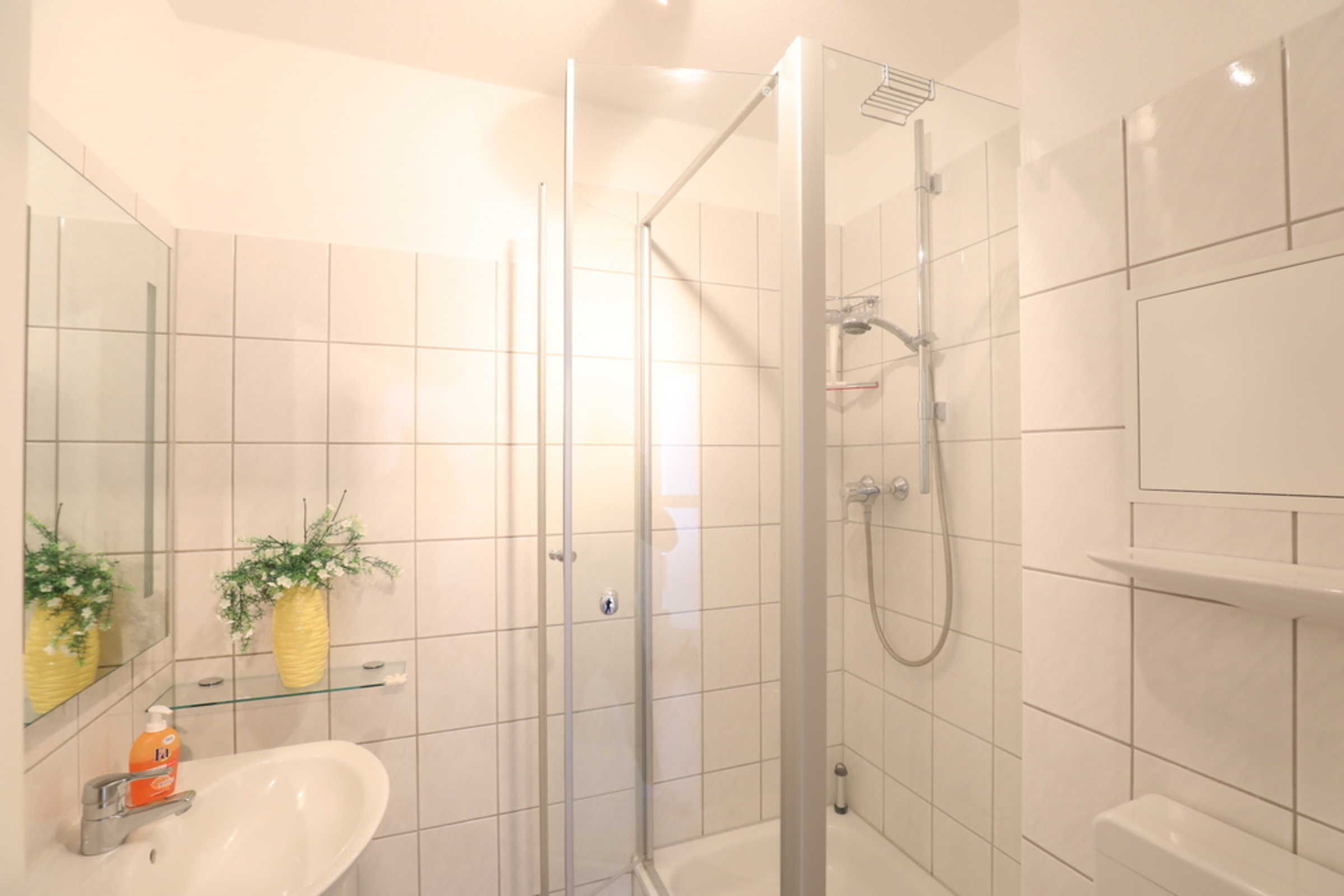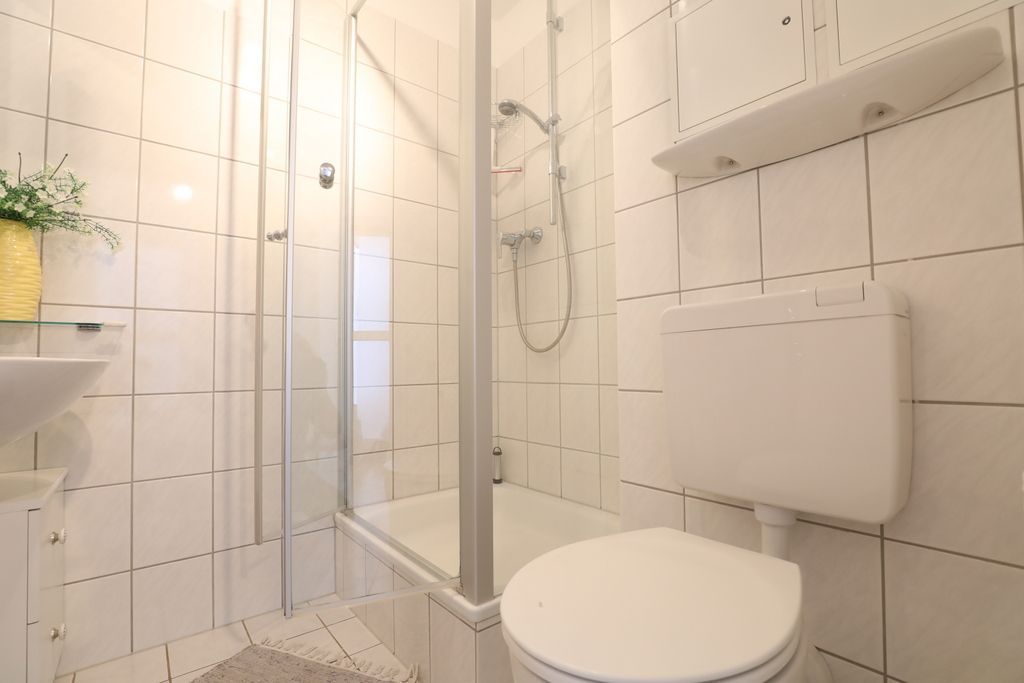 Im Bad finden Sie Dusche, Waschbecken und WC vor.