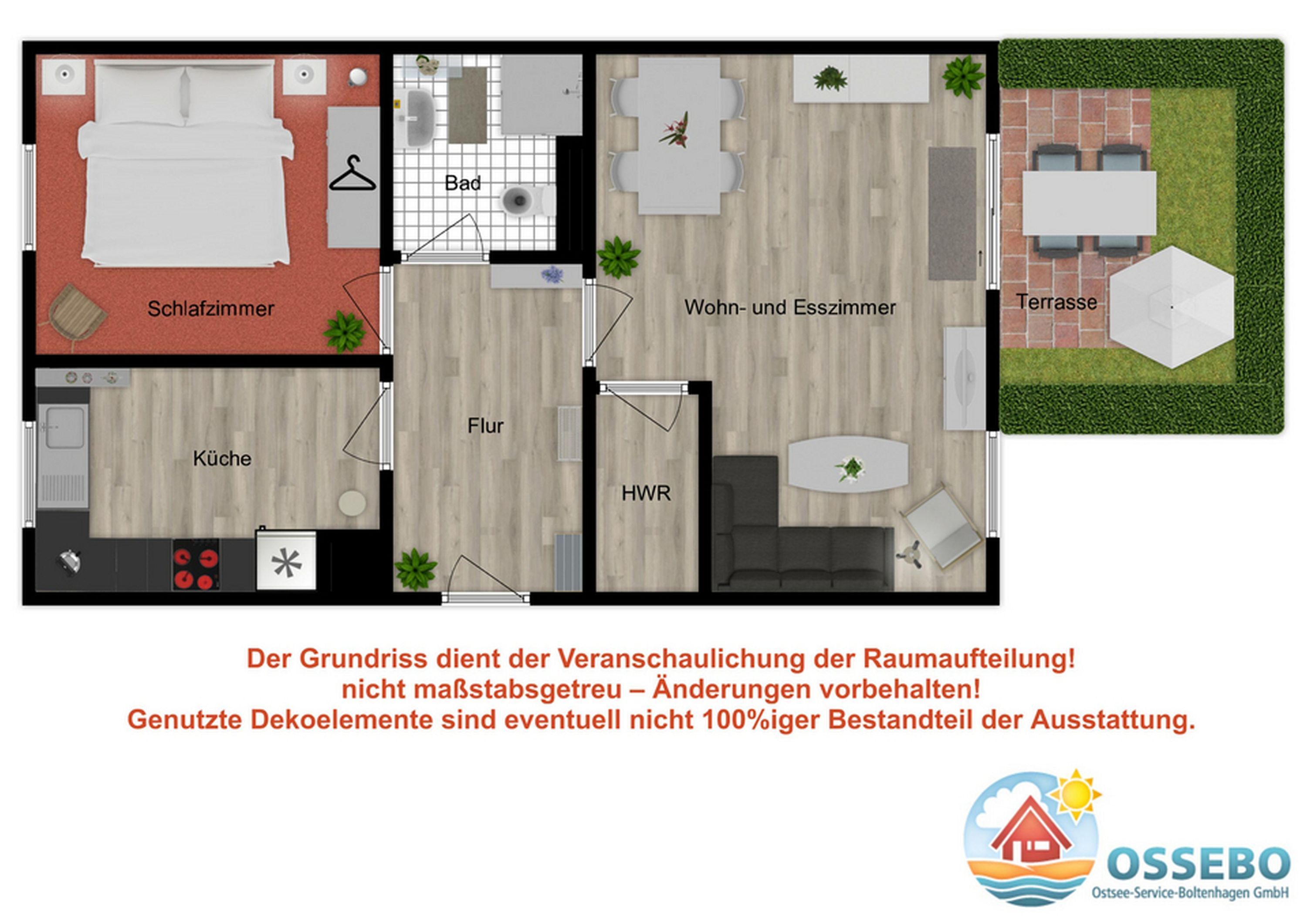 Die hell eingerichtete 2-Zimmer-Wohnung sorgt im Erdgeschoss auf knapp 55qm Wohnfläche mit ihrer reichlichen Ausstattung bis 4 Personen für einen unbeschwerten Urlaub.