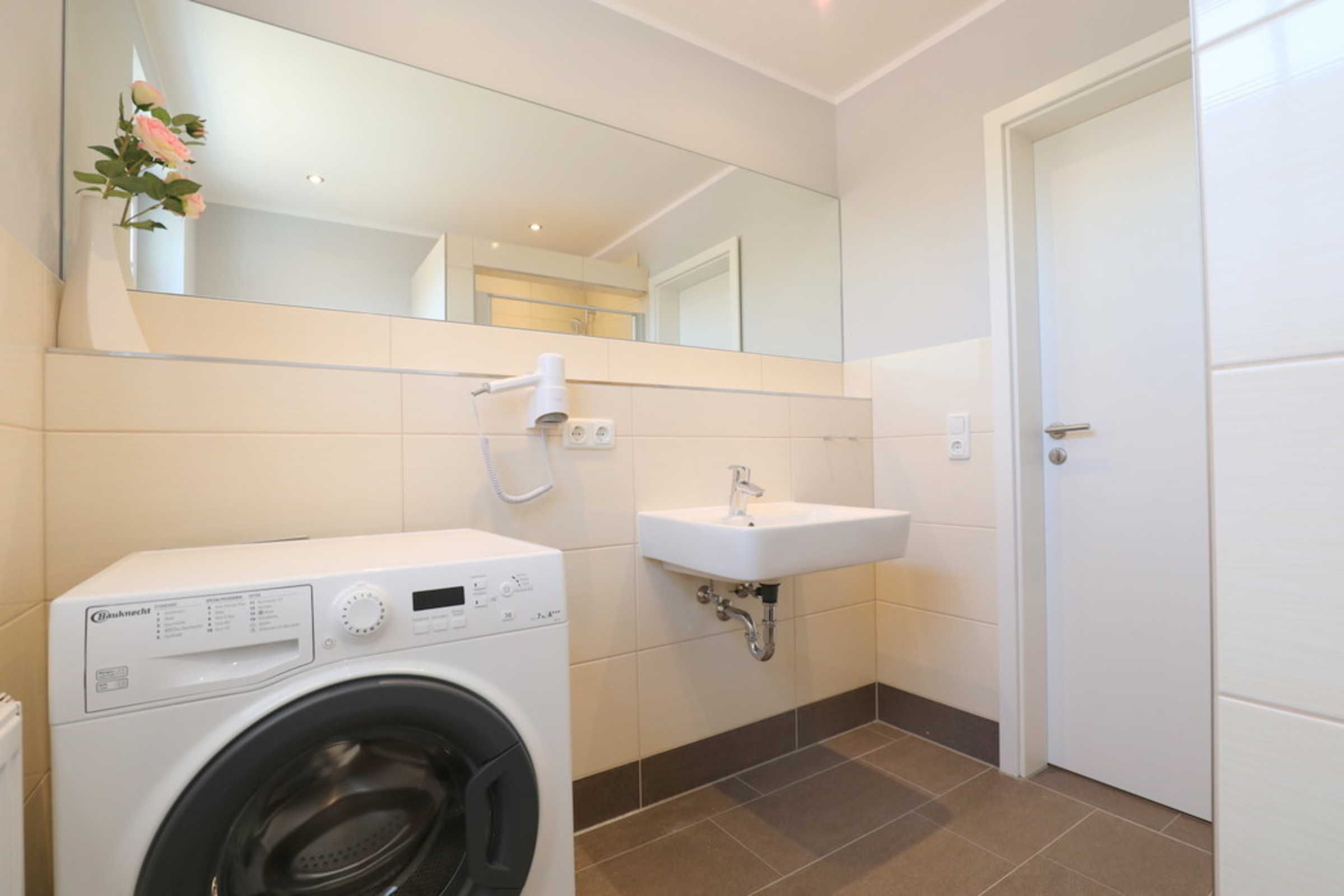 Ein großes Bad mit Tageslicht bietet eine barrierefreie Dusche, Waschbecken, WC und auch eine Waschmaschine.