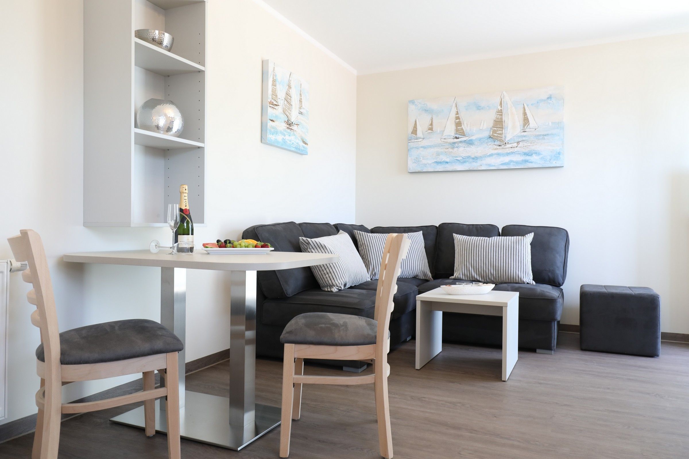 Ein offener Wohn- und Essbereich mit integrierter Küchenzeile und zwei Südost-Balkone sorgen für einen komfortablen Aufenthalt. Das bequeme Ecksofa lädt zum gemütlichen Beisammensein oder zum Entspannen beim Fernsehen ein.